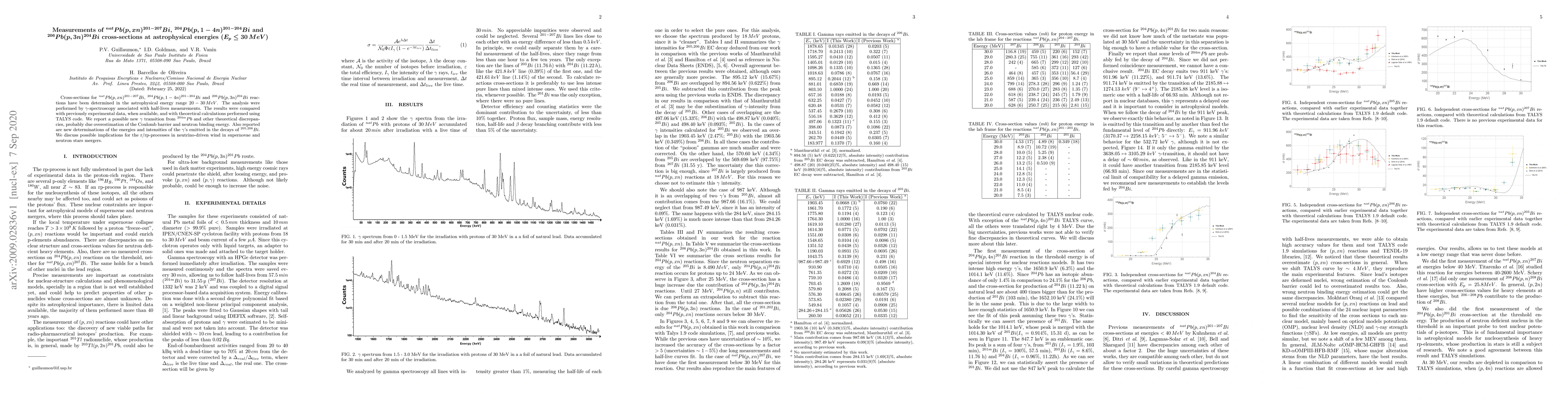 Cross-sections for ${}^{nat}Pb(p,xn){}^{201-207}Bi$, ${}^{204}Pb(p,1-4n){}^{201-204}Bi$ and ${}^{206}Pb(p,3n){}^{204}Bi$ reactions have been determined in the astrophysical energy range $20-30 \, MeV$. The analysis were performed by $\gamma$-spectroscopy associated with half-lives measurements. The results were compared with previously experimental data, when available, and with theoretical calculations performed using TALYS code. We report a possible new $\gamma$ transition from ${}^{204m}{Pb}$ and other theoretical discrepancies, probably due overestimation of the Coulomb barrier and neutron binding energy. Also reported are new determinations of the energies and intensities of the $\gamma$'s emitted in the decays of ${}^{205,206}Bi$. We discuss possible implications for the r/rp-processes in neutrino-driven wind in supernovae and neutron stars mergers.