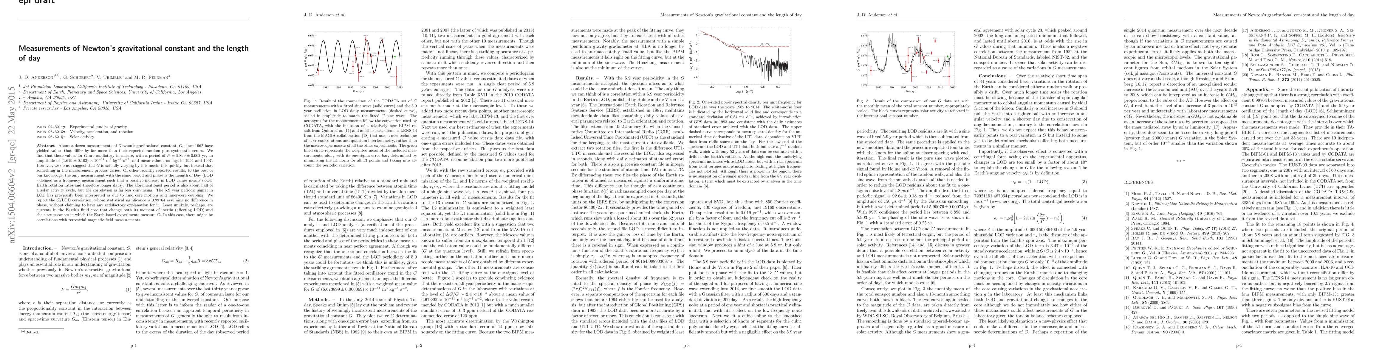 About a dozen measurements of Newton's gravitational constant, G, since 1962 have yielded values that differ by far more than their reported random plus systematic errors. We find that these values for G are oscillatory in nature, with a period of P = 5.899 +/- 0.062 yr, an amplitude of (1.619 +/- 0.103) x 10^{-14} m^3 kg^{-1} s^{-2}, and mean-value crossings in 1994 and 1997. However, we do not suggest that G is actually varying by this much, this quickly, but instead that something in the measurement process varies. Of other recently reported results, to the best of our knowledge, the only measurement with the same period and phase is the Length of Day (LOD - defined as a frequency measurement such that a positive increase in LOD values means slower Earth rotation rates and therefore longer days). The aforementioned period is also about half of a solar activity cycle, but the correlation is far less convincing. The 5.9 year periodic signal in LOD has previously been interpreted as due to fluid core motions and inner-core coupling. We report the G/LOD correlation, whose statistical significance is 0.99764 assuming no difference in phase, without claiming to have any satisfactory explanation for it. Least unlikely, perhaps, are currents in the Earth's fluid core that change both its moment of inertia (affecting LOD) and the circumstances in which the Earth-based experiments measure G. In this case, there might be correlations with terrestrial magnetic field measurements.