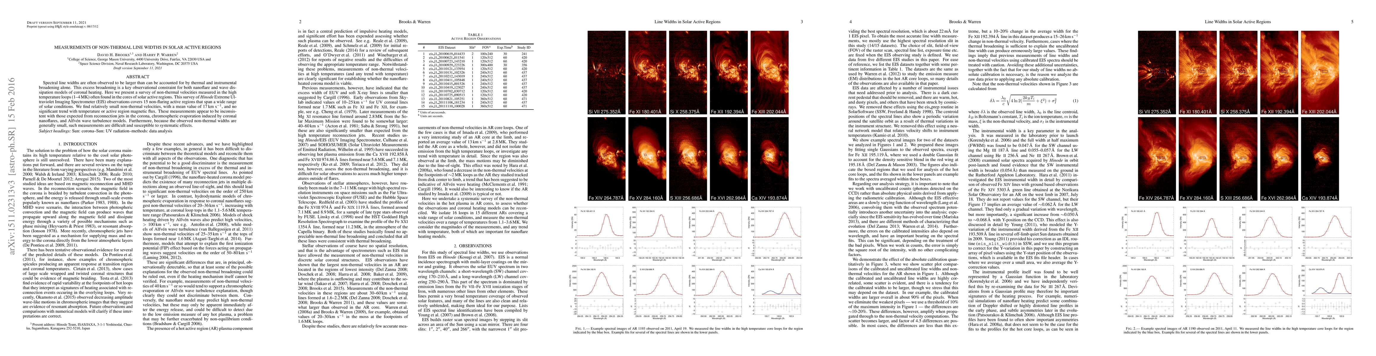 This study measures non-thermal line widths in solar active regions using Hinode EIS observations, finding small non-thermal velocities averaging 17 km s$^{-1}$. The results do not support models predicting larger non-thermal broadening from coronal heating mechanisms.