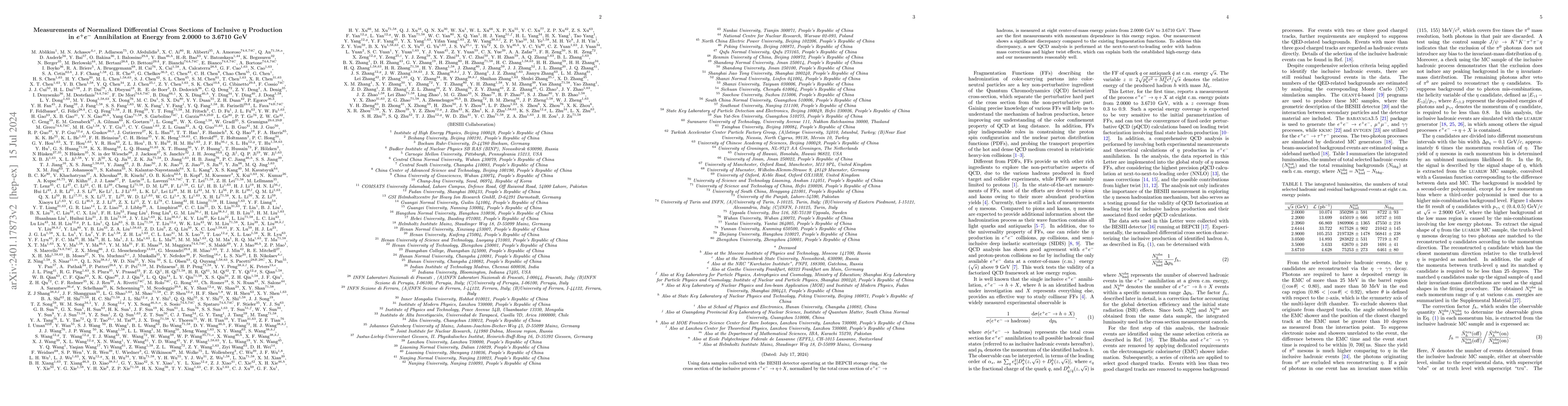 Using data samples collected with the BESIII detector operating at the BEPCII storage ring, the cross section of the inclusive process $e^{+}e^{-} \to \eta + X$, normalized by the total cross section of $e^{+}e^{-} \to \text{hadrons}$, is measured at eight center-of-mass energy points from 2.0000 GeV to 3.6710 GeV. These are the first measurements with momentum dependence in this energy region. Our measurement shows a significant discrepancy from calculations with the existing fragmentation functions. To address this discrepancy, a new QCD analysis is performed at the next-to-next-to-leading order with hadron mass corrections and higher twist effects, which can explain both the established high-energy data and our measurements reasonably well.