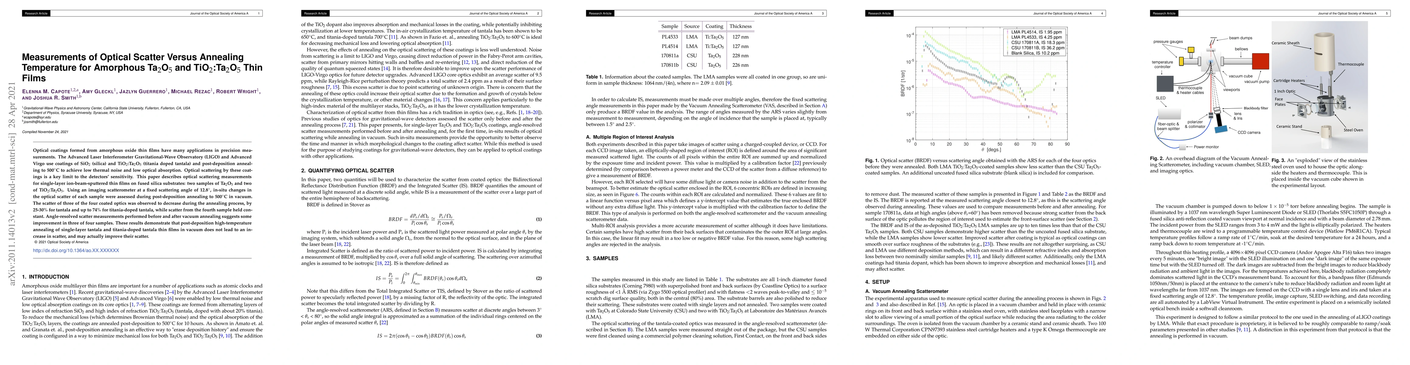 Optical coatings formed from amorphous oxide thin films have many applications in precision measurements. The Advanced Laser Interferometer Gravitational-Wave Observatory (LIGO) and Advanced Virgo use coatings of SiO$_2$ (silica) and TiO$_2$:Ta$_2$O$_5$ (titania doped tantala) and post-deposition annealing to 500$^\circ$C to achieve low thermal noise and low optical absorption. Optical scattering by these coatings is a key limit to the detectors' sensitivity. This paper describes optical scattering measurements for single-layer ion-beam-sputtered thin films on fused silica substrates: two samples of Ta$_2$O$_5$ and two of TiO$_2$:Ta$_2$O$_5$. Using an imaging scatterometer at a fixed scattering angle of 12.8$^\circ$, in-situ changes in the optical scatter of each sample were assessed during post-deposition annealing to 500$^\circ$C in vacuum. The scatter of three of the four coated optics was observed to decrease during the annealing process, by 25-30$\%$ for tantala and up to 74$\%$ for titania-doped tantala, while scatter from the fourth sample held constant. Angle-resolved scatter measurements performed before and after vacuum annealing suggests some improvement in three of four samples. These results demonstrate that post-deposition high-temperature annealing of single-layer tantala and titania-doped tantala thin films in vacuum does not lead to an increase in scatter, and may actually improve their scatter.