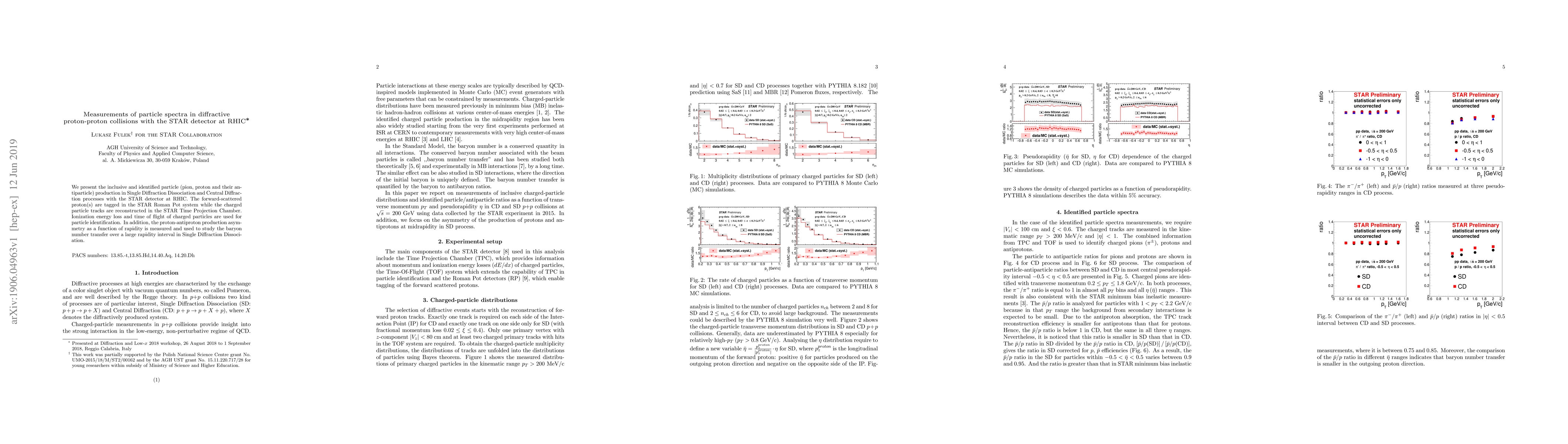 We present the inclusive and identified particle (pion, proton and their antiparticle) production in Single Diffraction Dissociation and Central Diffraction processes with the STAR detector at RHIC. The forward-scattered proton(s) are tagged in the STAR Roman Pot system while the charged particle tracks are reconstructed in the STAR Time Projection Chamber. Ionization energy loss and time of flight of charged particles are used for particle identification. In addition, the proton-antiproton production asymmetry as a function of rapidity is measured and used to study the baryon number transfer over a large rapidity interval in Single Diffraction Dissociation.