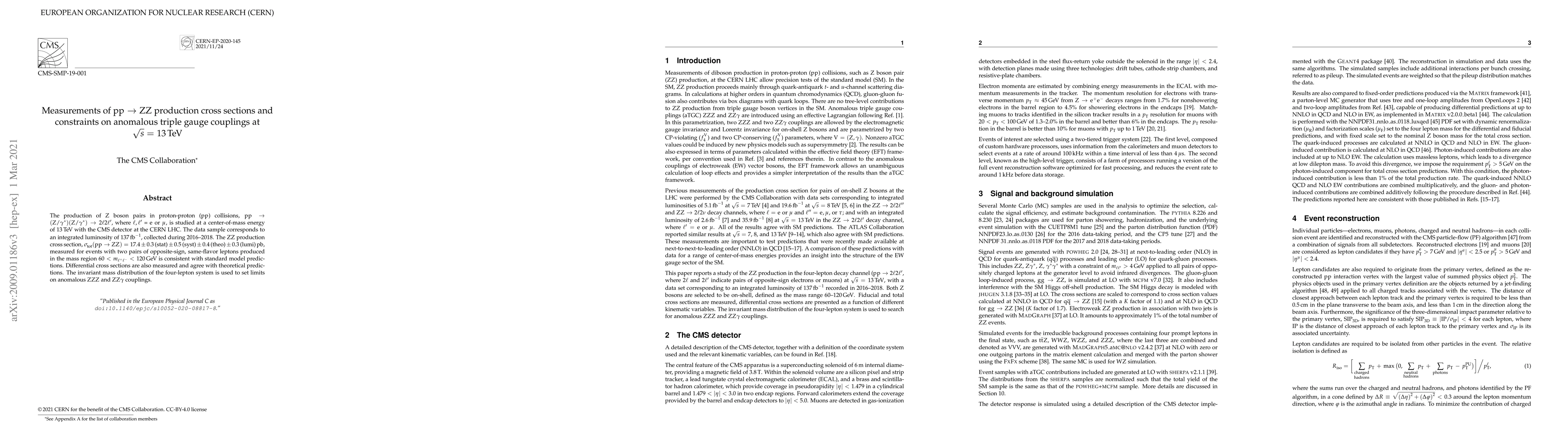 This paper reports on the measurement of Z boson pair production cross sections in proton-proton collisions at 13 TeV using the CMS detector, finding results consistent with standard model predictions. It also sets constraints on anomalous triple gauge couplings using the invariant mass distribution of four-lepton events.