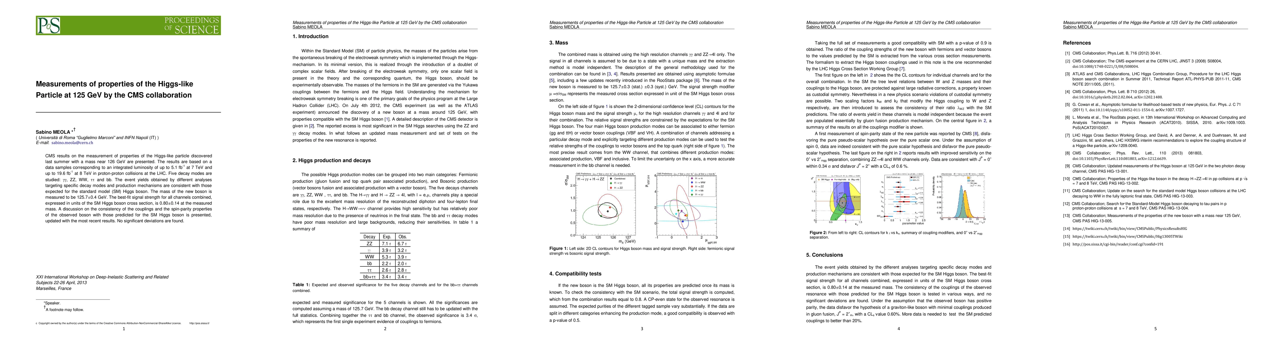 CMS results on the measurement of properties of the Higgs-like particle discovered last summer with a mass near 126 GeV are presented. The results are based on a data samples corresponding to an integrated luminosity of up to 5.1 fb-1 at 7 TeV and up to 19.6 fb-1 at 8 TeV in proton-proton collisions at the LHC. Five decay modes are studied: gamma-gamma, ZZ, WW, tau-tau and bb. The event yields obtained by different analyses targeting specific decay modes and production mechanisms are consistent with those expected for the Standard Model (SM) Higgs boson. The mass of the new boson is measured to be 125.7 +- 0.4 GeV. The best-fit signal strength for all channels combined, expressed in units of the SM Higgs boson cross section, is 0.80 +- 0.14 at the measured mass. A discussion on the consistency of the couplings and the spin-parity properties of the observed boson with those predicted for the SM Higgs boson is presented, updated with the most recent results. No significant deviations are found.