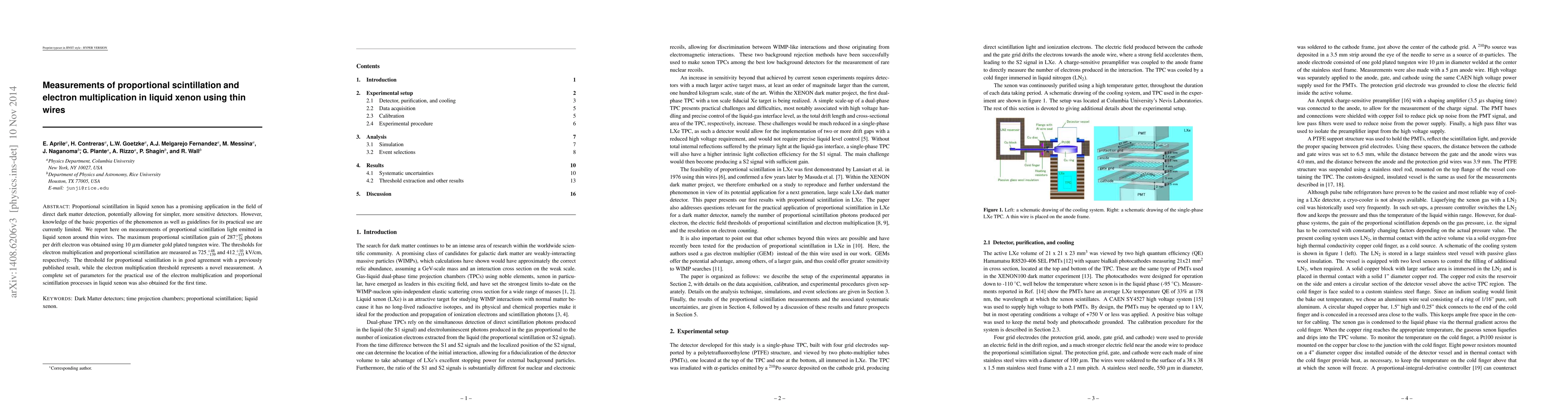 This study measures the proportional scintillation and electron multiplication in liquid xenon using thin wires, achieving a maximum gain of 287 photons per drift electron. It reports novel thresholds for electron multiplication and proportional scintillation, providing essential parameters for potential dark matter detection applications.