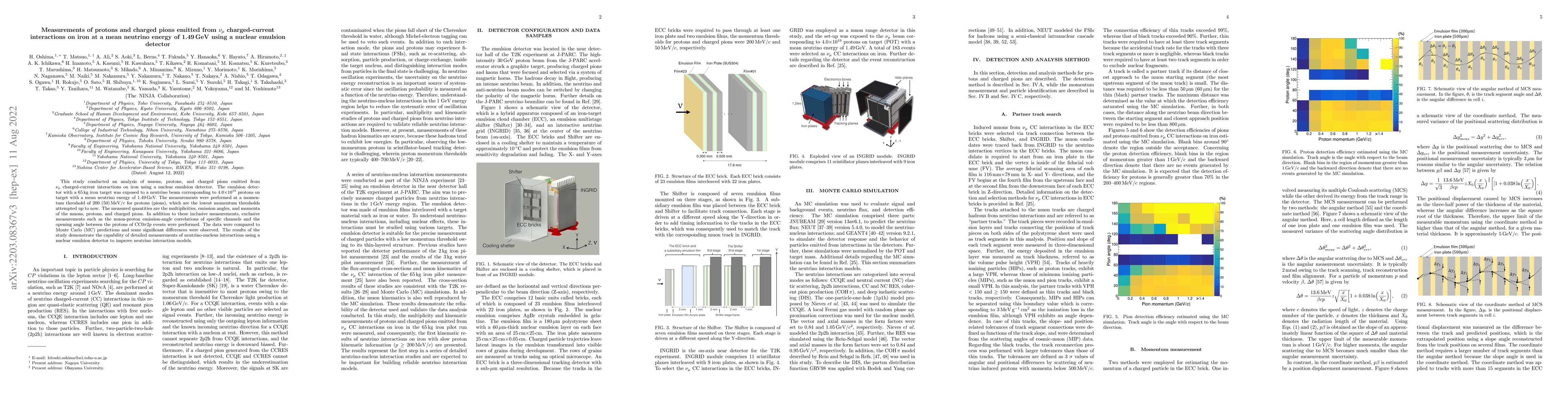 This study investigates $\nu_{\mu}$ charged-current interactions on iron using a nuclear emulsion detector, measuring protons, pions, and their emission characteristics at a low momentum threshold. Significant differences between observed data and Monte Carlo predictions were noted, highlighting the potential of nuclear emulsion detectors for refining neutrino interaction models.