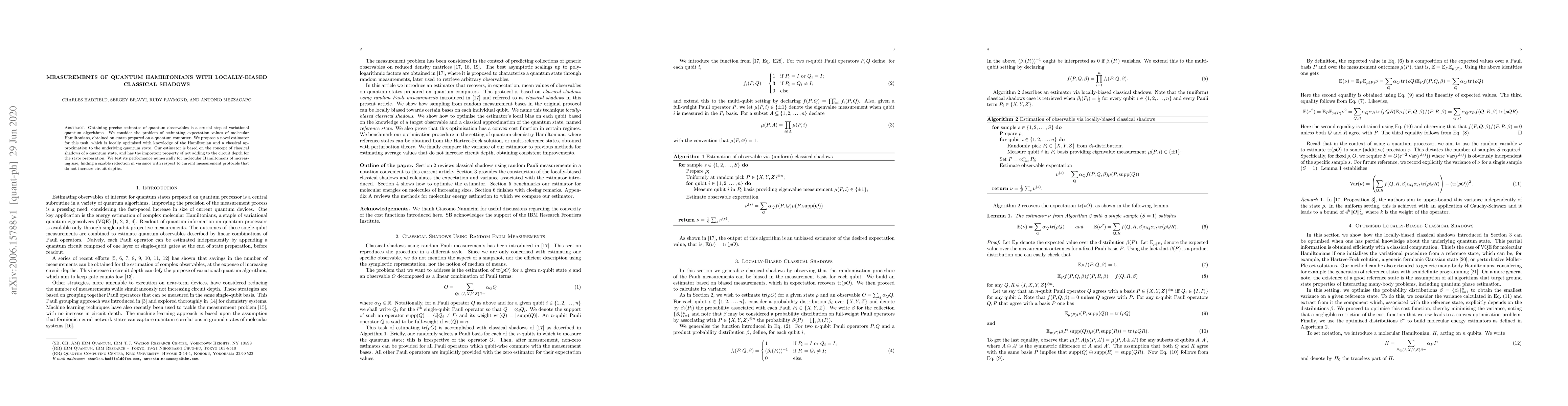 This paper proposes a novel estimator for estimating the expectation values of quantum Hamiltonians using locally-biased classical shadows, which optimizes measurements without increasing the circuit depth for state preparation. Numerical tests show a significant reduction in variance compared to existing protocols.