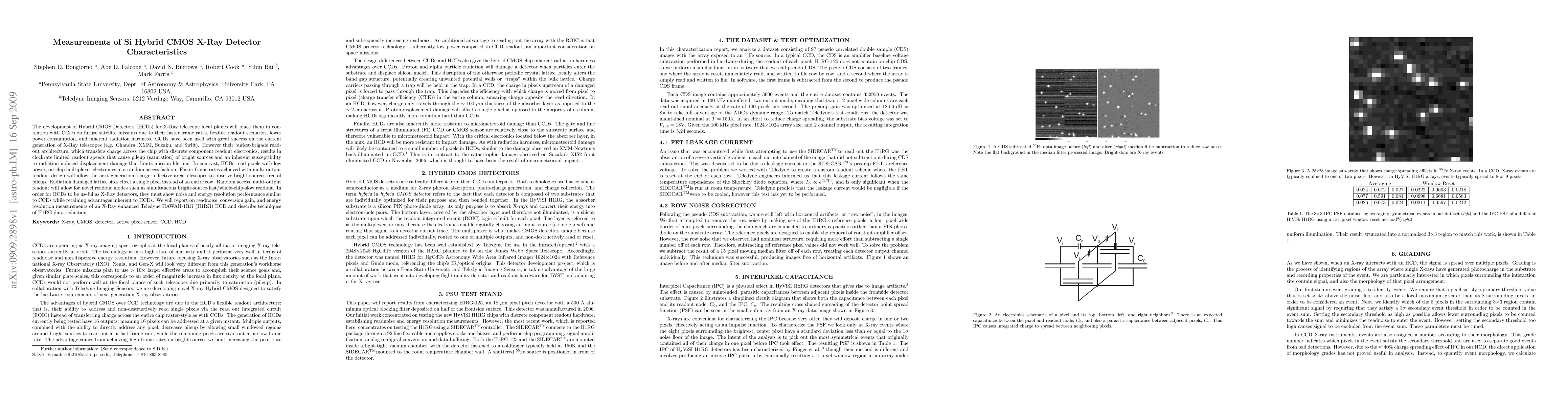 The development of Hybrid CMOS Detectors (HCDs) for X-Ray telescope focal planes will place them in con- tention with CCDs on future satellite missions due to their faster frame rates, flexible readout scenarios, lower power consumption, and inherent radiation hardness. CCDs have been used with great success on the current generation of X-Ray telescopes (e.g. Chandra, XMM, Suzaku, and Swift). However their bucket-brigade read-out architecture, which transfers charge across the chip with discrete component readout electronics, results in clockrate limited readout speeds that cause pileup (saturation) of bright sources and an inherent susceptibility to radiation induced displacement damage that limits mission lifetime. In contrast, HCDs read pixels with low power, on-chip multiplexer electronics in a random access fashion. Faster frame rates achieved with multi-output readout design will allow the next generation's larger effective area telescopes to observe bright sources free of pileup. Radiation damaged lattice sites effect a single pixel instead of an entire row. Random access, multi-output readout will allow for novel readout modes such as simultaneous bright-source-fast/whole-chip-slow readout. In order for HCDs to be useful as X-Ray detectors, they must show noise and energy resolution performance similar to CCDs while retaining advantages inherent to HCDs. We will report on readnoise, conversion gain, and energy resolution measurements of an X-Ray enhanced Teledyne HAWAII-1RG (H1RG) HCD and describe techniques of H1RG data reduction.