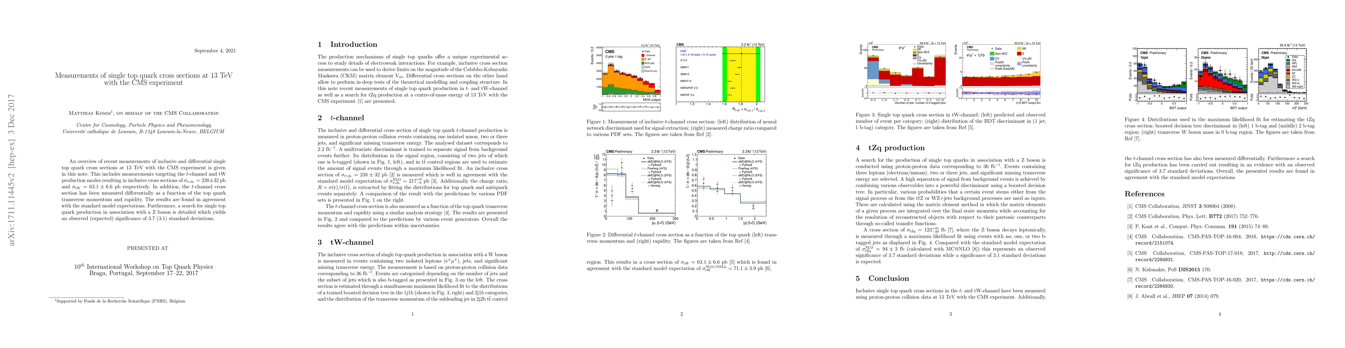 This paper reports measurements of single top quark cross sections at 13 TeV using the CMS experiment, finding inclusive cross sections for $t$-channel and tW modes to be 238±32 pb and 63.1±6.6 pb, respectively, and confirming differential cross sections align with standard model predictions. Additionally, a search for single top quark production with a Z boson shows a 3.7 (expected 3.1) standard deviation significance.