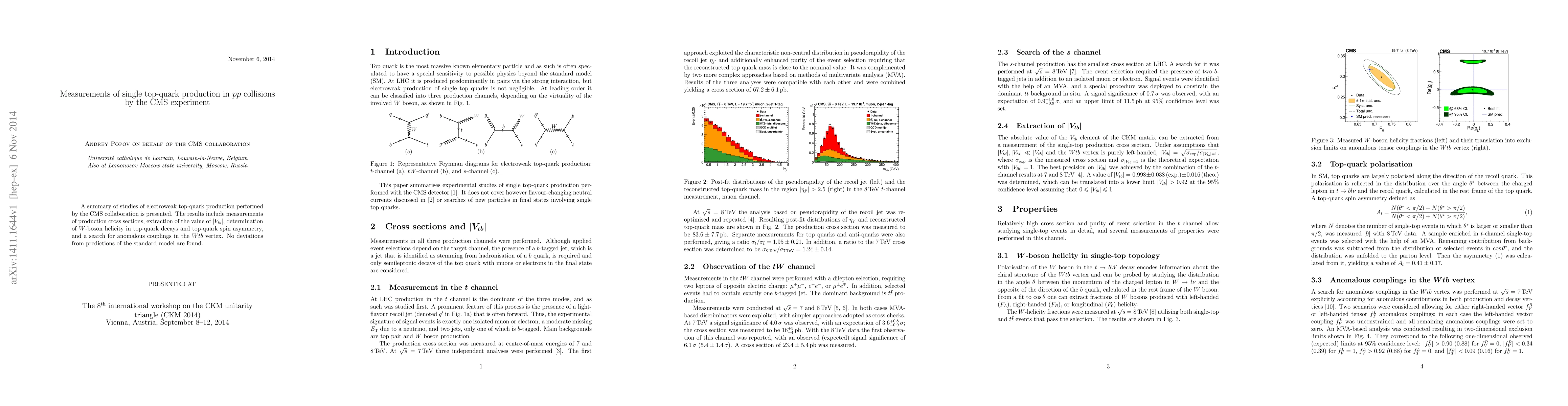 The CMS experiment reports measurements of single top-quark production in proton-proton collisions, including cross sections, $|V_{tb}|$ extraction, W-boson helicity, and top-quark spin asymmetry, with no observed deviations from Standard Model predictions.