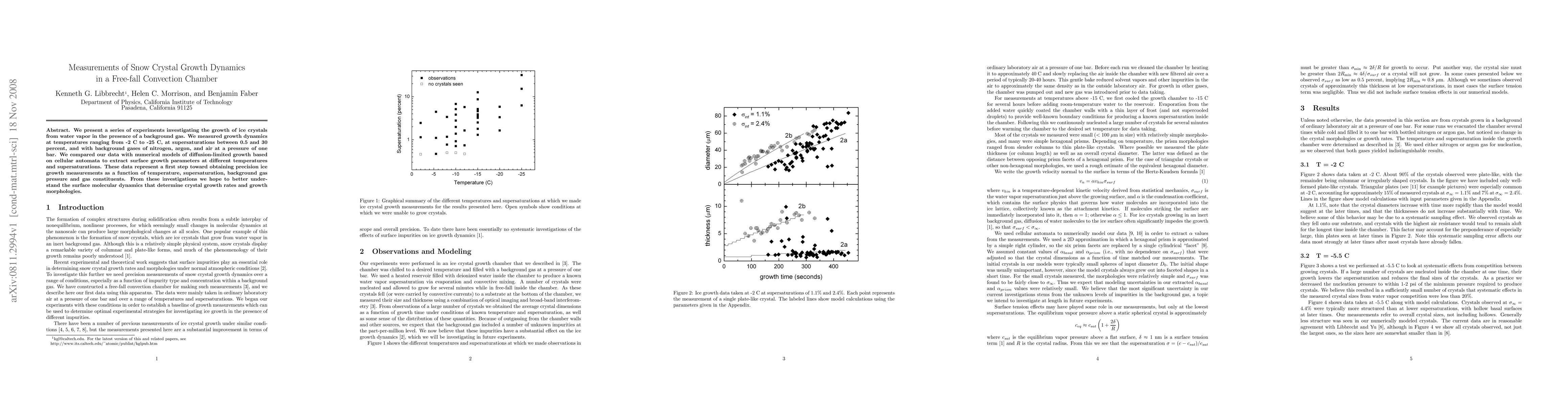 This study measures the growth dynamics of ice crystals from water vapor in a controlled environment, comparing experimental data with numerical models to extract surface growth parameters. The goal is to understand the molecular dynamics influencing crystal growth rates and morphologies under varying temperatures, supersaturations, and background gases.