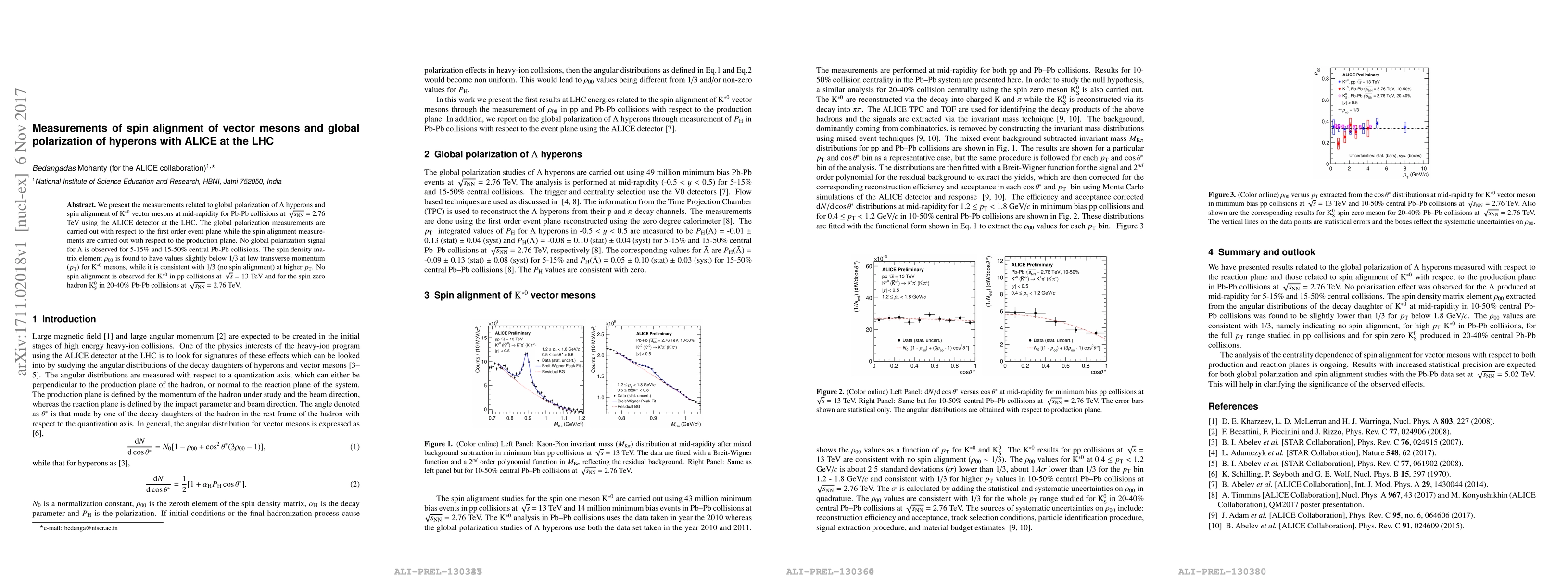 We present the measurements related to global polarization of $\Lambda$ hyperons and spin alignment of $\mathrm{K^{*0}}~$ vector mesons at mid-rapidity for Pb-Pb collisions at $\sqrt{s_{\mathrm{NN}}}~$= 2.76 TeV using the ALICE detector at the LHC. The global polarization measurements are carried out with respect to the first order event plane while the spin alignment measurements are carried out with respect to the production plane. No global polarization signal for $\Lambda$ is observed for 5-15\% and 15-50\% central Pb-Pb collisions. The spin density matrix element $\rho_{00}$ is found to have values slightly below 1/3 at low transverse momentum ($p_{\mathrm{T}}$) for $\mathrm{K^{*0}}~$ mesons, while it is consistent with 1/3 (no spin alignment) at higher $p_{\mathrm{T}}$. No spin alignment is observed for $\mathrm{K^{*0}}~$ in pp collisions at $\sqrt{s}$ = 13 TeV and for the spin zero hadron $\mathrm{K^{0}_{S}}~$ in 20-40\% Pb-Pb collisions at $\sqrt{s_{\mathrm{NN}}}~$ = 2.76 TeV.