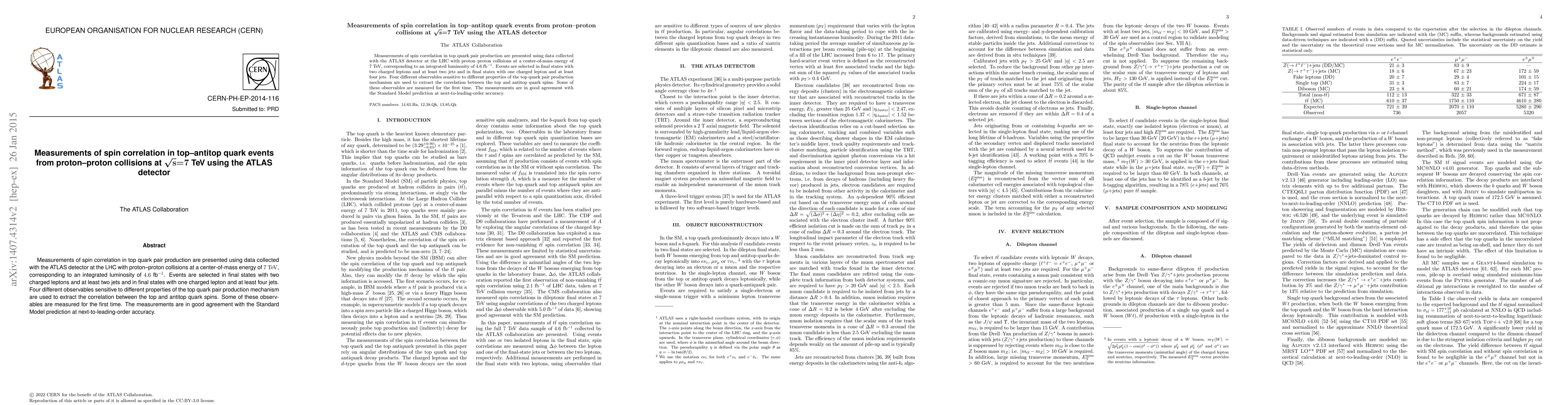 This paper reports measurements of spin correlation in top-antitop quark events from proton-proton collisions at 7 TeV using the ATLAS detector, finding results consistent with Standard Model predictions. Four observables are used to extract spin correlations, including some measured for the first time.