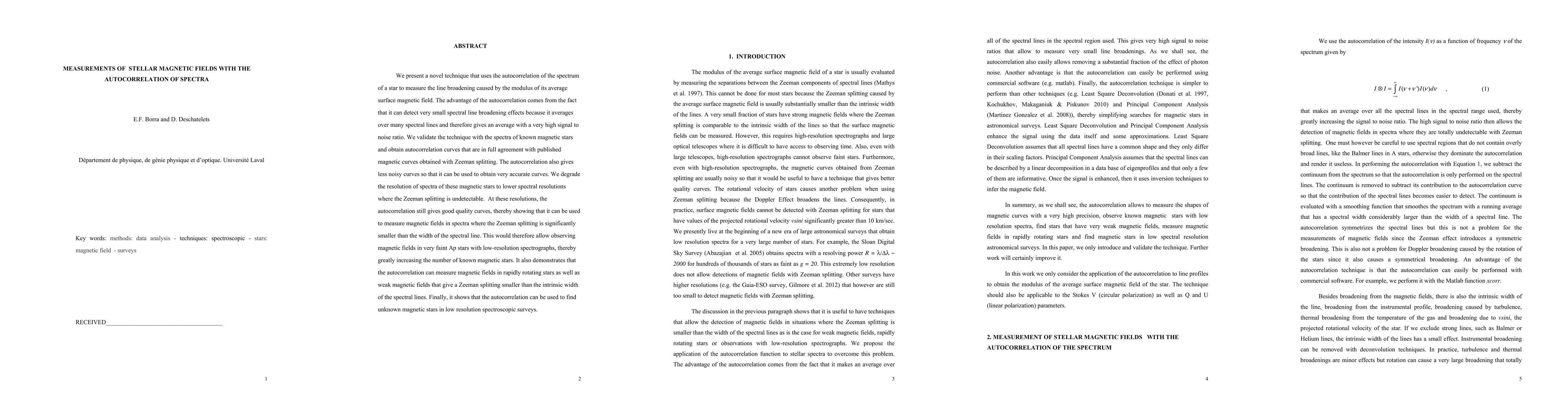 This research introduces a new method to measure stellar magnetic fields using the autocorrelation of star spectra, which averages over many lines for high signal-to-noise ratio. Validated with known magnetic stars, this technique can detect small broadening effects and is effective even at low spectral resolutions where Zeeman splitting is undetectable. It promises to identify magnetic fields in faint Ap stars and rapidly rotating stars, as well as discover unknown magnetic stars in low-resolution surveys.