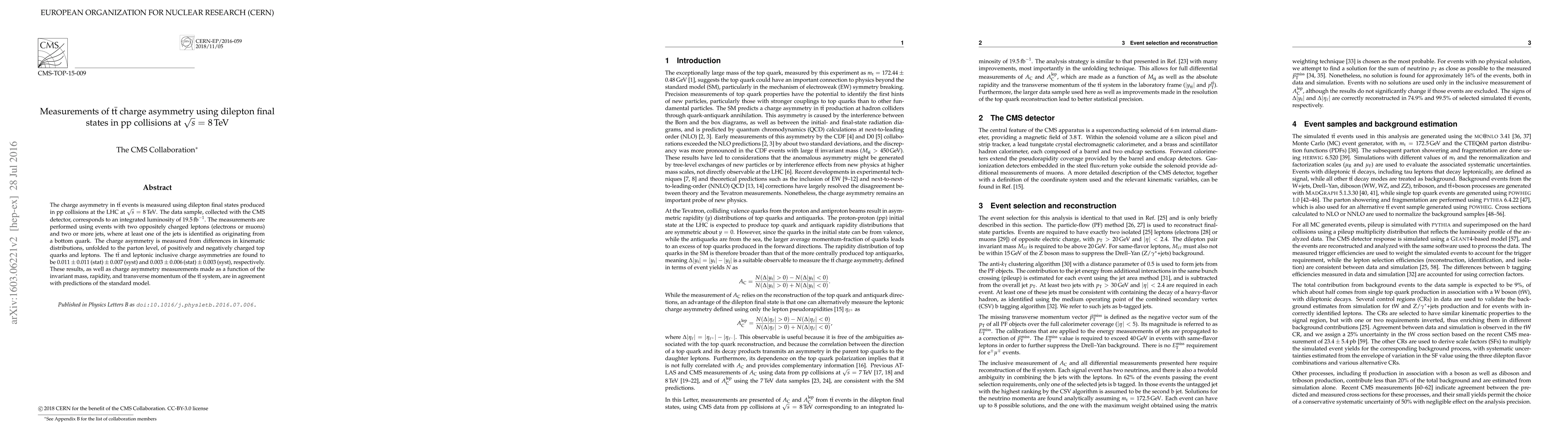 This study measures the charge asymmetry in t t-bar events using dilepton final states in pp collisions at 8 TeV with the CMS detector, finding a t t-bar charge asymmetry of 0.011 +/- 0.011, consistent with standard model predictions. The results also show a leptonic charge asymmetry of 0.003 +/- 0.006, further supporting theoretical models.