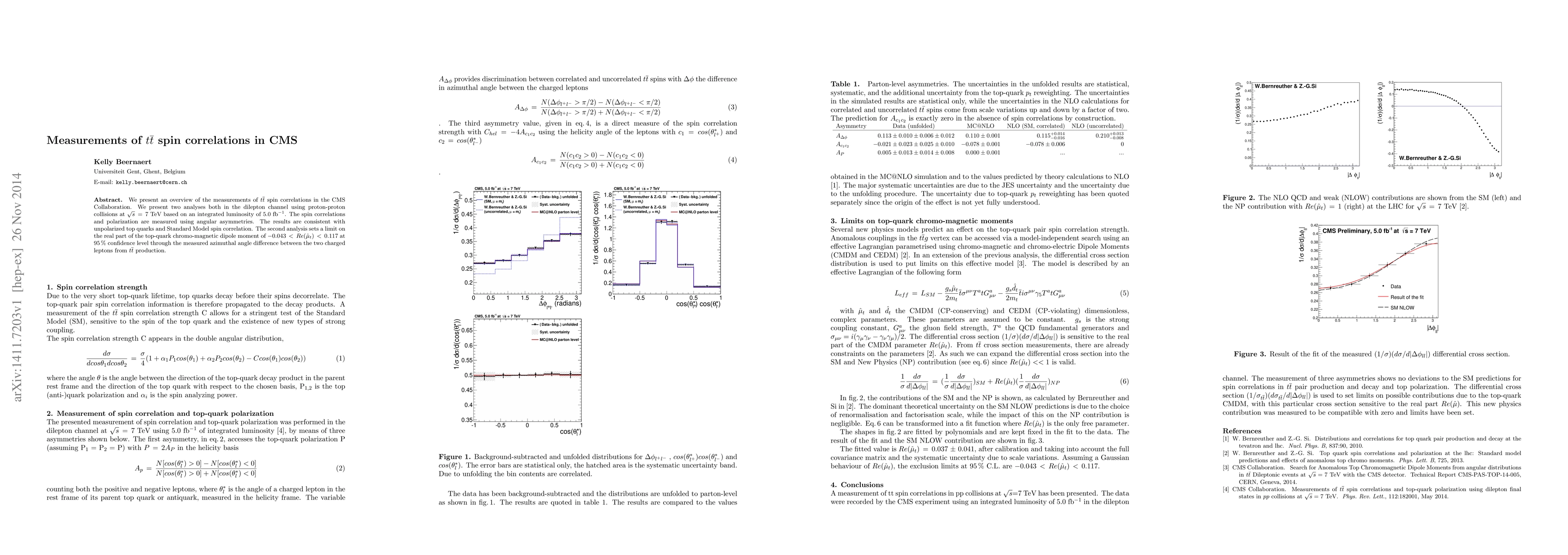 This paper presents measurements of $t\bar{t}$ spin correlations in the CMS Collaboration using proton-proton collisions at 7 TeV, finding results consistent with unpolarized top quarks and Standard Model predictions. It also sets a limit on the real part of the top-quark chromo-magnetic dipole moment.