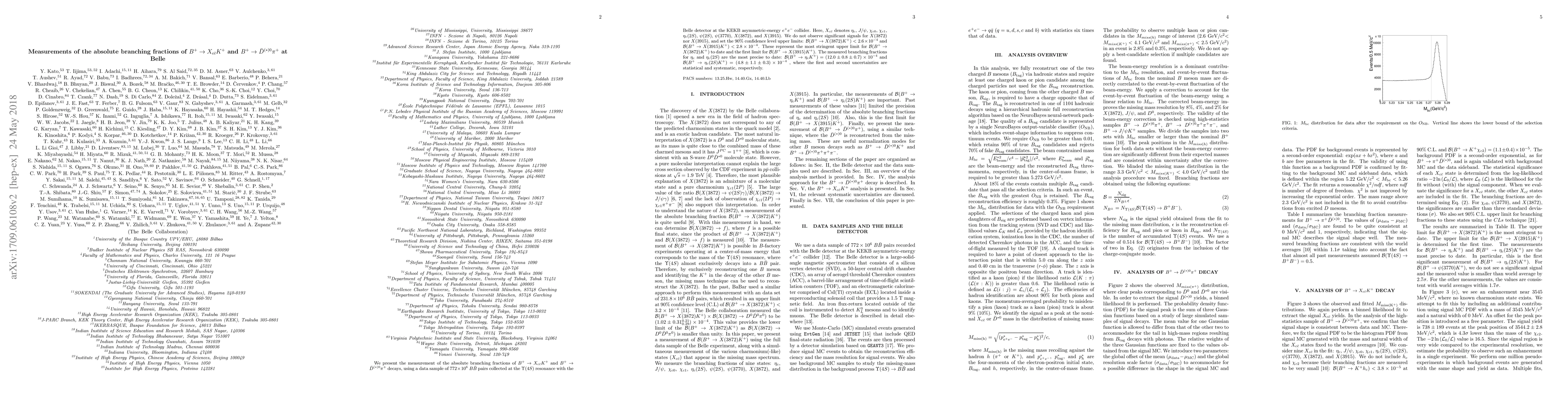 The Belle experiment measured the absolute branching fractions for $B^{+} \to X_{c\bar{c}} K^{+}$ and $B^{+} \to \bar{D}^{(\ast) 0} \pi^{+}$ decays, setting stringent upper limits for $X(3872)$ and $X(3915)$ and achieving the most precise measurements for $\eta_{c}$ and $\eta_{c}(2S)$ decays.