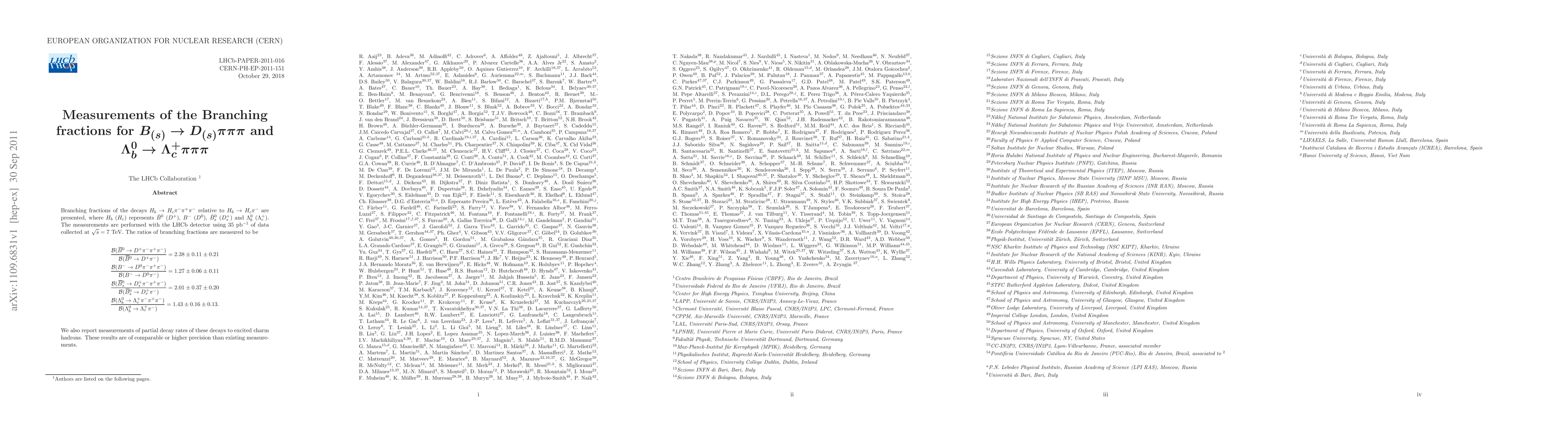 Branching fractions of the decays $H_b\to H_c\pi^-\pi^+\pi^-$ relative to $H_b\to H_c\pi^-$ are presented, where $H_b$ ($H_c$) represents B^0-bar($D^+$), $B^-$ ($D^0$), B_s^0-bar ($D_s^+$) and $\Lambda_b^0$ ($\Lambda_c^+$). The measurements are performed with the LHCb detector using 35${\rm pb^{-1}}$ of data collected at $\sqrt{s}=7$ TeV. The ratios of branching fractions are measured to be B(B^0-bar -> D^+\pi^-\pi^+\pi^-)/ B(B^0-bar -> D^+\pi^-) = 2.38\pm0.11\pm0.21 B(B^- -> D^0\pi^-\pi^+\pi^-) / B(B^- -> D^0\pi^-) = 1.27\pm0.06\pm0.11 B(B_s^0-bar -> D_s^+\pi^-\pi^+\pi^-) / B(B_s^0-bar -> D_s^+\pi^-) = 2.01\pm0.37\pm0.20 B(\Lambda_b^0->\Lambda_c^+\pi^-\pi^+\pi^-) / B(\Lambda_b^0 -> \Lambda_c^+\pi^-) = 1.43\pm0.16\pm0.13. We also report measurements of partial decay rates of these decays to excited charm hadrons. These results are of comparable or higher precision than existing measurements.