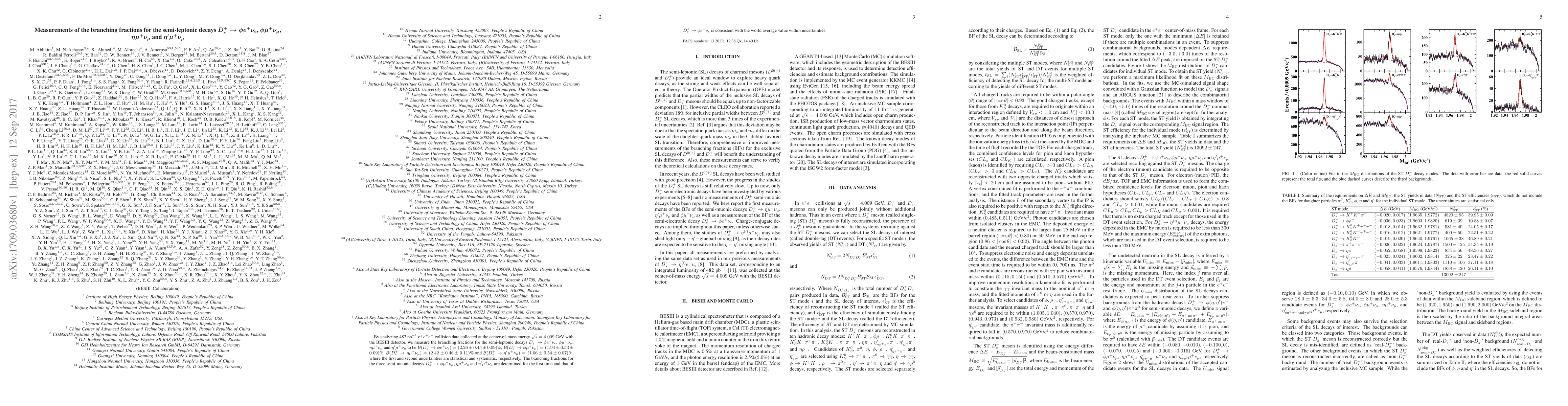 By analyzing 482 pb$^{-1}$ of $e^+e^-$ collision data collected at the center-of-mass energy $\sqrt s=4.009$ GeV with the BESIII detector, we measure the %absolute branching fractions for the semi-leptonic decays $D_{s}^{+}\to \phi e^{+}\nu_{e}$, $\phi \mu^{+}\nu_{\mu}$, $\eta \mu^{+}\nu_{\mu}$ and $\eta'\mu^{+}\nu_{\mu}$ to be ${\mathcal B}(D_{s}^{+}\to\phi e^{+}\nu_{e})=(2.26\pm0.45\pm0.09)$\%, ${\mathcal B}(D_{s}^{+}\to\phi \mu^{+}\nu_{\mu})=(1.94\pm0.53\pm0.09)$\%, ${\mathcal B}(D_{s}^{+}\to\eta \mu^{+}\nu_{\mu})=(2.42\pm0.46\pm0.11)$\% and ${\mathcal B}(D_{s}^{+}\to\eta'\mu^{+} \nu_{\mu}) = (1.06\pm0.54\pm0.07)$\%, where the first and second uncertainties are statistical and systematic, respectively. The branching fractions for the three semi-muonic decays $D_s^+\to\phi \mu^+\nu_\mu, \eta \mu^+\nu_\mu$ and $\eta' \mu^+\nu_\mu$ are determined for the first time and that of $D^+_s\to \phi e^+\nu_e$ is consistent with the world average value within uncertainties.