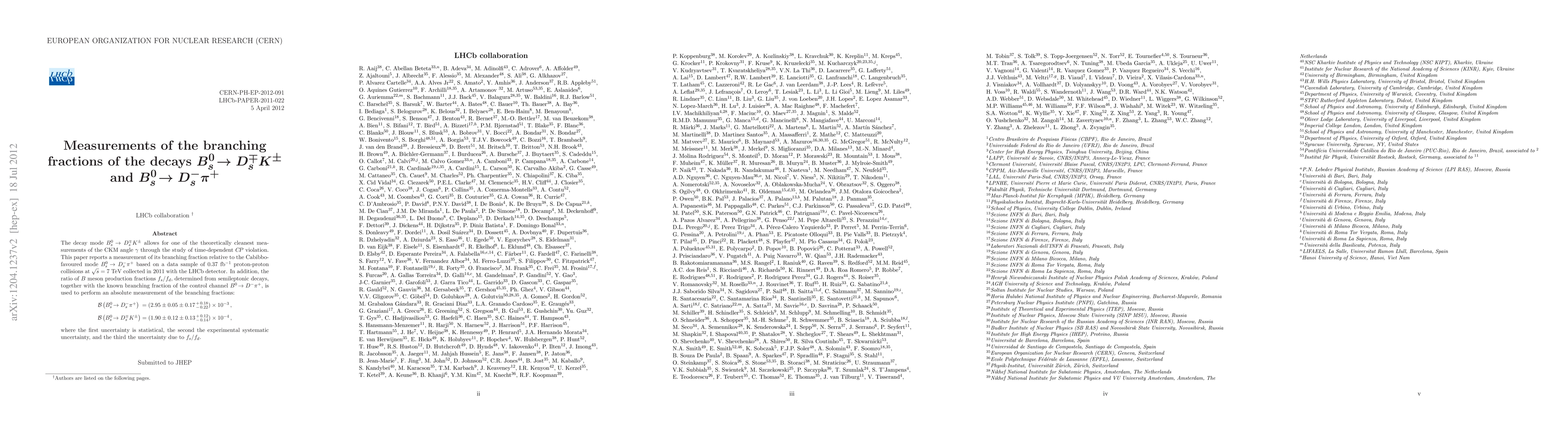 This paper measures the branching fractions for the decays $B^{0}_{s} \to D^{\mp}_{s} K^{\pm}$ and $B^{0}_{s} \to D^{-}_{s} \pi^{+}$ using LHCb data from 2011, reporting $B (\B^0_s \to D^-_s \pi^+) = (2.95 \pm 0.05 \pm 0.17^{\,+\,0.18}_{\,-\,0.22}) \times 10^{-3}$ and $B (\B^0_s \to D^\mp_s K^\pm) = (1.90 \pm 0.12 \pm 0.13^{\,+\,0.12}_{\,-\,0.14}) \times 10^{-4}$.