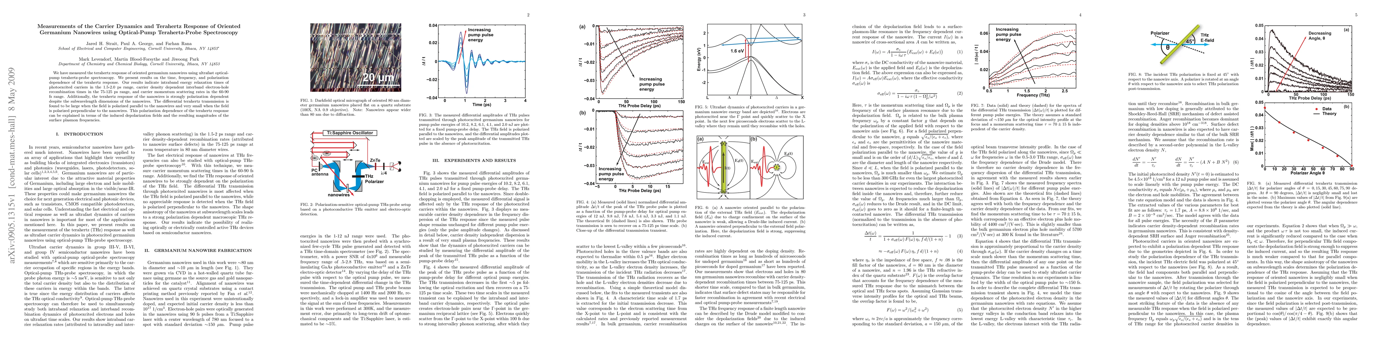 Optical-pump terahertz-probe spectroscopy was used to measure the time, frequency, and polarization dependence of the THz response of germanium nanowires.