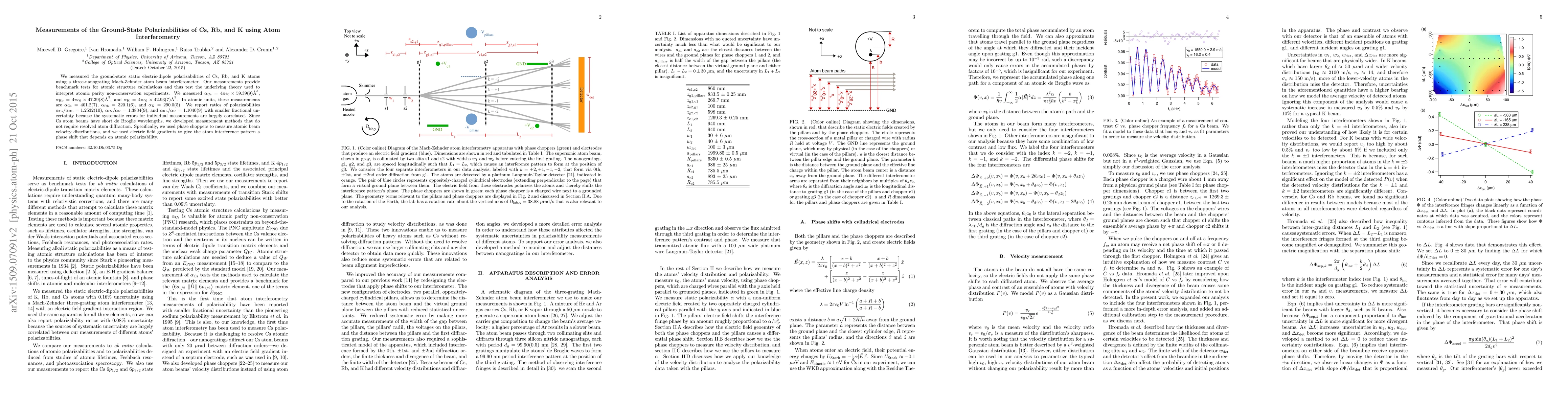 We measured the ground-state static electric-dipole polarizabilities of Cs, Rb, and K atoms using a three-nanograting Mach-Zehnder atom beam interferometer. Our measurements provide benchmark tests for atomic structure calculations and thus test the underlying theory used to interpret atomic parity non-conservation experiments. We measured $\alpha_{\mathrm{Cs}} = 4\pi\epsilon_0 \times 59.45(11) \AA^3$, $\alpha_{\mathrm{Rb}} = 4\pi\epsilon_0 \times 47.44(9) \AA^3$, and $\alpha_{\mathrm{K}} = 4\pi\epsilon_0 \times 42.97(8) \AA^3$. In atomic units, these measurements are $\alpha_{\mathrm{Cs}} = 401.2(7)$, $\alpha_{\mathrm{Rb}} = 320.1(6)$, and $\alpha_{\mathrm{K}} = 290.0(5)$. We report ratios of polarizabilities $\alpha_{\mathrm{Cs}}/\alpha_{\mathrm{Rb}} = 1.2532(10)$, $\alpha_{\mathrm{Cs}}/\alpha_{\mathrm{K}} = 1.3835(9)$, and $\alpha_{\mathrm{Rb}}/\alpha_{\mathrm{K}} = 1.1040(9)$ with smaller fractional uncertainty because the systematic errors for individual measurements are largely correlated. Since Cs atom beams have short de Broglie wavelengths, we developed measurement methods that do not require resolved atom diffraction. Specifically, we used phase choppers to measure atomic beam velocity distributions, and we used electric field gradients to give the atom interference pattern a phase shift that depends on atomic polarizability.