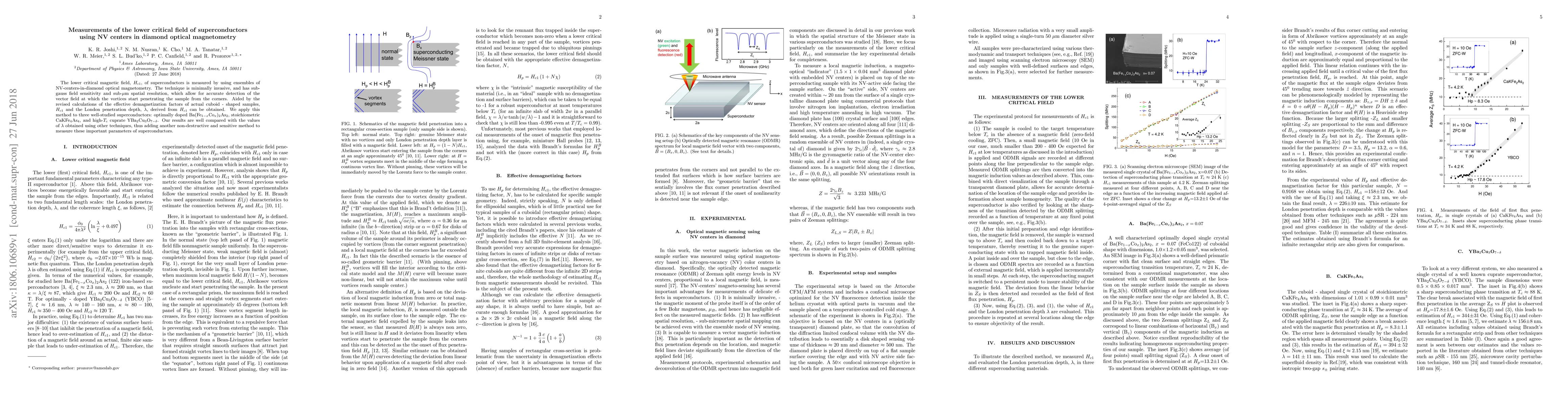 This paper measures the lower critical magnetic field $H_{c1}$ of superconductors using NV centers in diamond optical magnetometry, achieving sub-gauss sensitivity and sub-$\mu$m resolution. The method is applied to three superconductors, yielding results consistent with other techniques, thus providing a non-destructive alternative for measuring superconducting parameters.