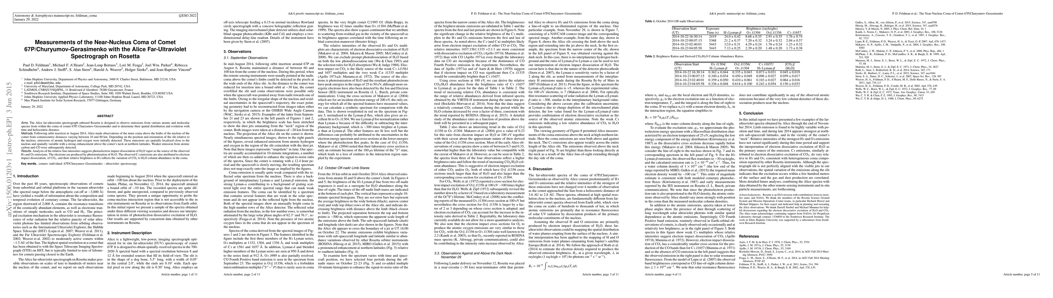 The Alice far-ultraviolet spectrograph on Rosetta detected atomic hydrogen, oxygen, carbon, and CO emissions in the inner coma of Comet 67P/Churyumov-Gerasimenko, indicating photoelectron impact dissociation of H2O and CO2 vapors as the primary sources of these emissions. The spatial variability and enhancements above the comet's neck suggest dynamic processes in the coma.