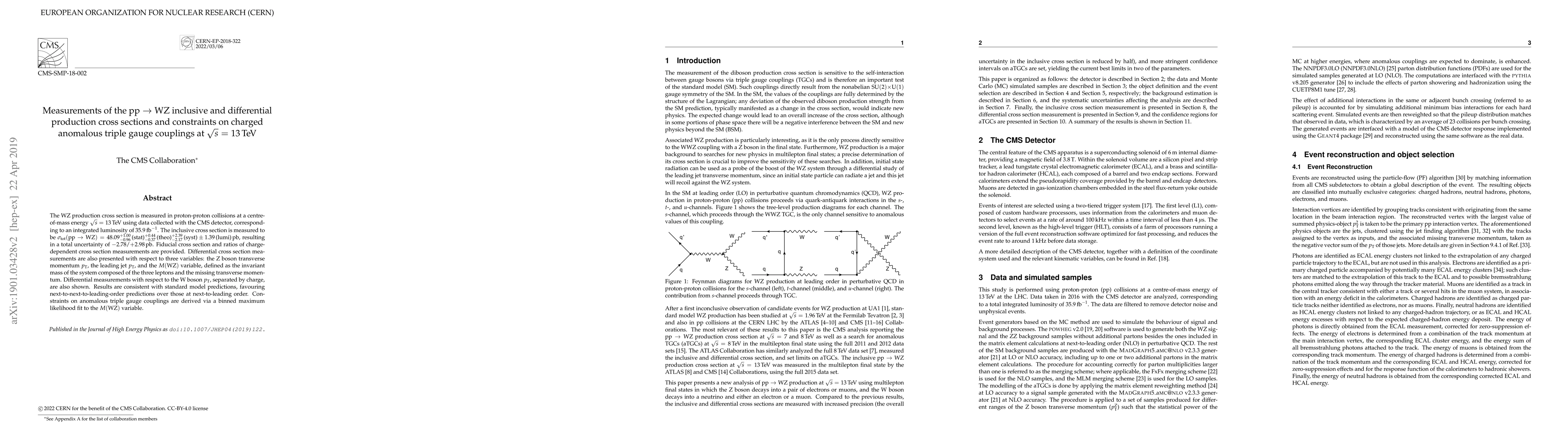 This paper measures the WZ production cross section in proton-proton collisions at 13 TeV using CMS detector data, yielding an inclusive cross section of 48.09 ± 2.98 pb. Differential cross sections and constraints on anomalous triple gauge couplings are also derived, consistent with standard model predictions.