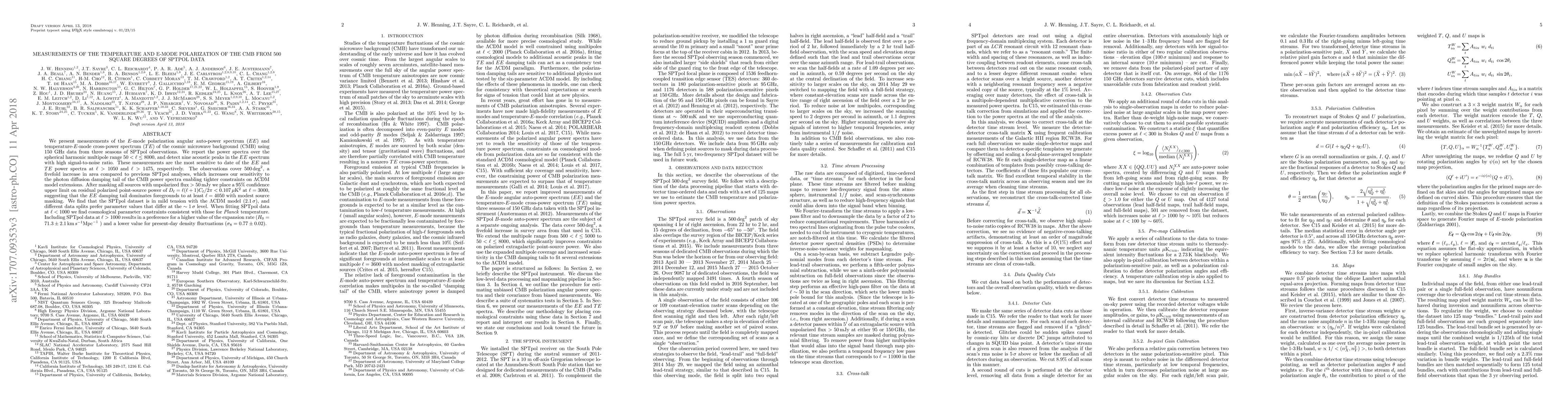 This paper reports sensitive measurements of the $E$-mode polarization and temperature of the CMB from SPTpol data, detecting nine acoustic peaks with high signal-to-noise. The study finds a mild tension with the $\Lambda CDM$ model and suggests a higher expansion rate and lower density fluctuations when including data at higher multipoles.