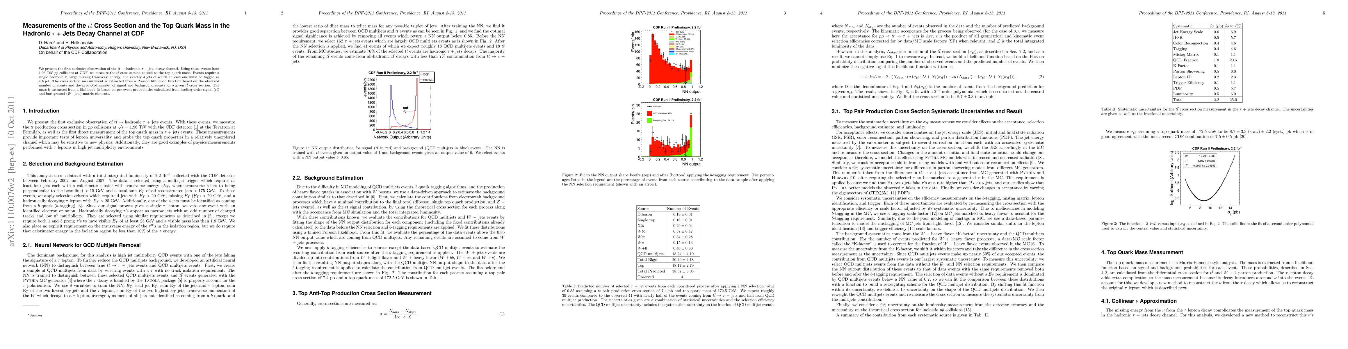 We present the first exclusive observation of the ttbar to hadronic tau + jets decay channel. Using these events from 1.96 TeV ppbar collisions at CDF, we measure the ttbar cross section as well as the top quark mass. Events require a single hadronic tau, large missing transverse energy, and exactly 4 jets of which at least one must be tagged as a b jet. The cross section measurement is extracted from a Poisson likelihood function based on the observed number of events and the predicted number of signal and background events for a given ttbar cross section. The mass is extracted from a likelihood fit based on per-event probabilities calculated from leading-order signal (ttbar) and background (W+jets) matrix elements.