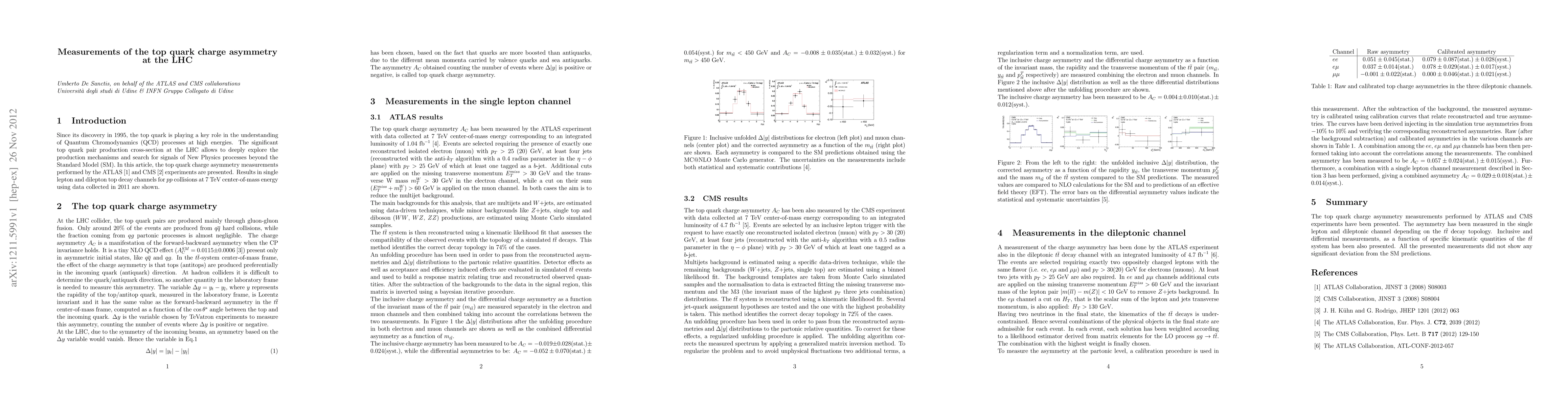This paper presents measurements of the top quark charge asymmetry from the ATLAS and CMS experiments at the LHC, focusing on single lepton and dilepton decay channels of the tt system, with both inclusive and differential asymmetry analyses.
