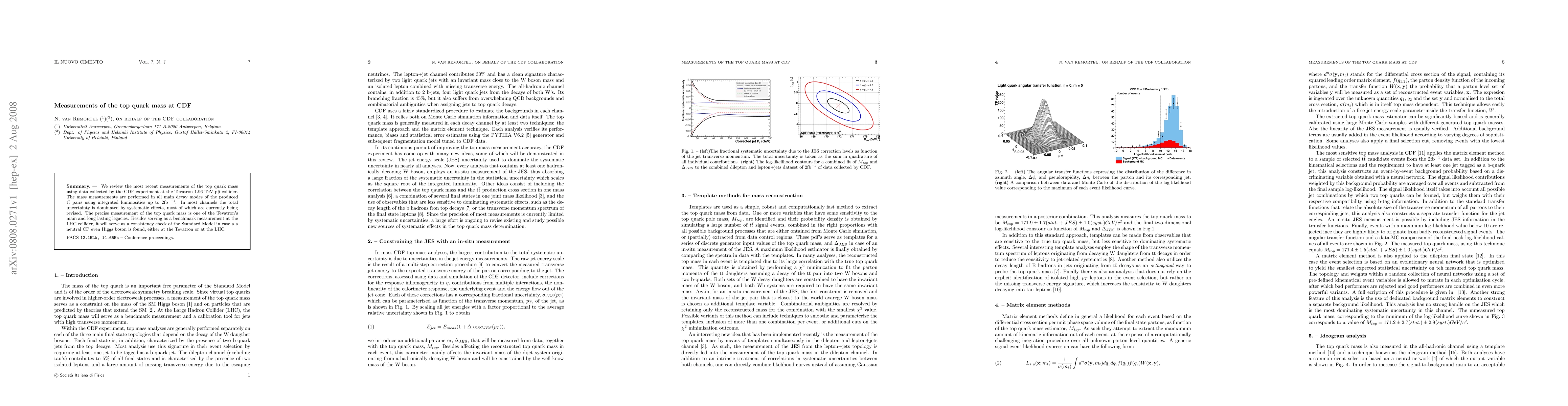 This paper reviews recent top quark mass measurements from the CDF experiment at the Tevatron collider, utilizing data up to 2fb-1. Systematic uncertainties dominate the total uncertainty, with ongoing revisions underway, highlighting the importance of this precise measurement for both the Standard Model and future LHC comparisons.