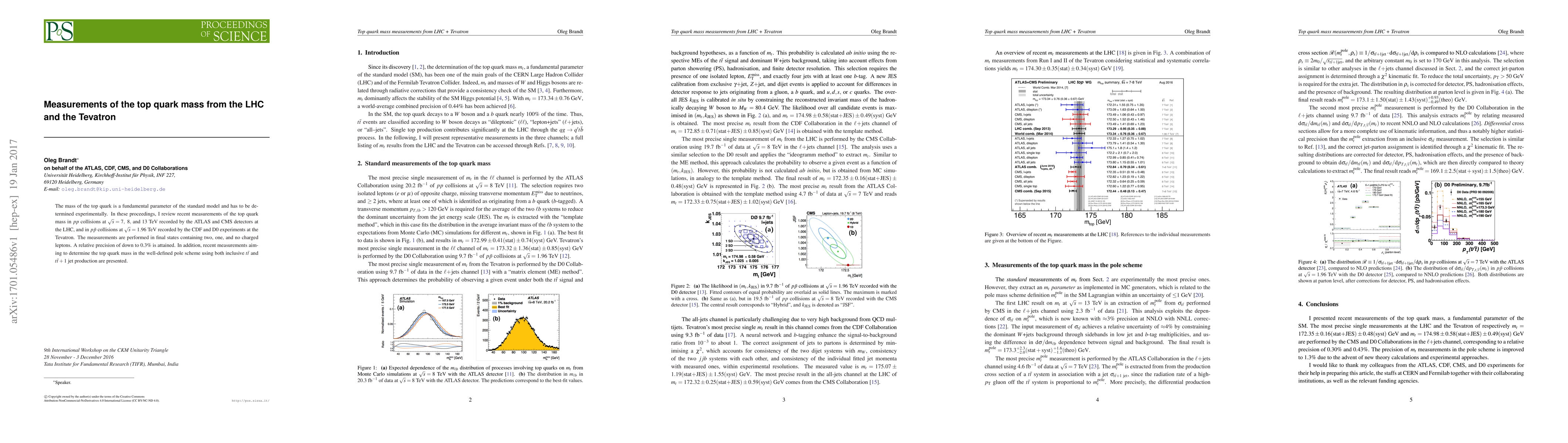 This paper reviews recent experimental measurements of the top quark mass from the LHC and Tevatron, utilizing data from ATLAS, CMS, CDF, and D0 experiments. The analysis achieves a relative precision of up to 0.3%, and includes results from various final states and methods to determine the top quark mass in the pole scheme.