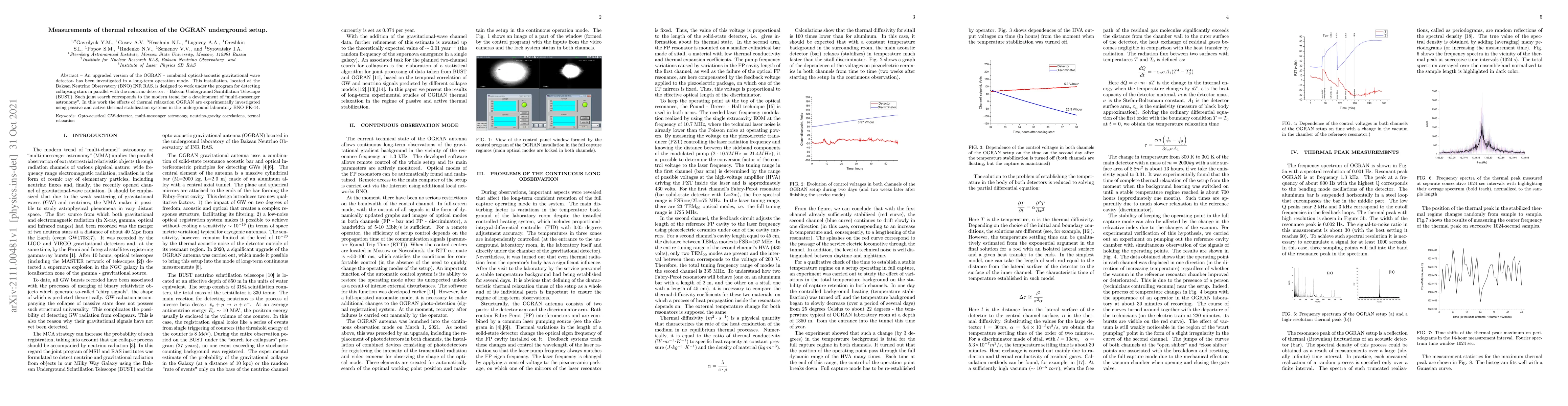 An upgraded version of the OGRAN -- combined optical-acoustic gravitational wave detector -- has been investigated in a long-term operation mode. This installation, located at the Baksan Neutrino Observatory (BNO) INR RAS, is designed to work under the program for detecting collapsing stars in parallel with the neutrino detector: Baksan Underground Scintillation Telescope (BUST). Such joint search corresponds to the modern trend for a development of "multi-messenger astronomy". In this work the effects of thermal relaxation OGRAN are experimentally investigated using passive and active thermal stabilization systems in the underground laboratory BNO PK-14.
