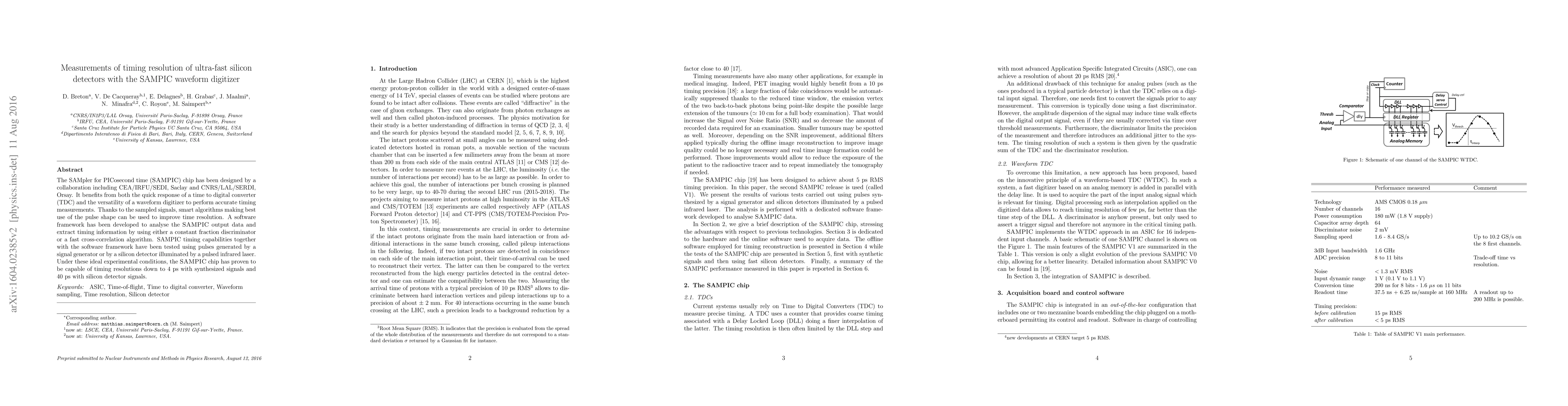 This paper evaluates the timing resolution of ultra-fast silicon detectors using the SAMPIC waveform digitizer, demonstrating resolutions down to 4 ps with synthesized signals and 40 ps with silicon detector signals, utilizing advanced algorithms and a software framework for data analysis.