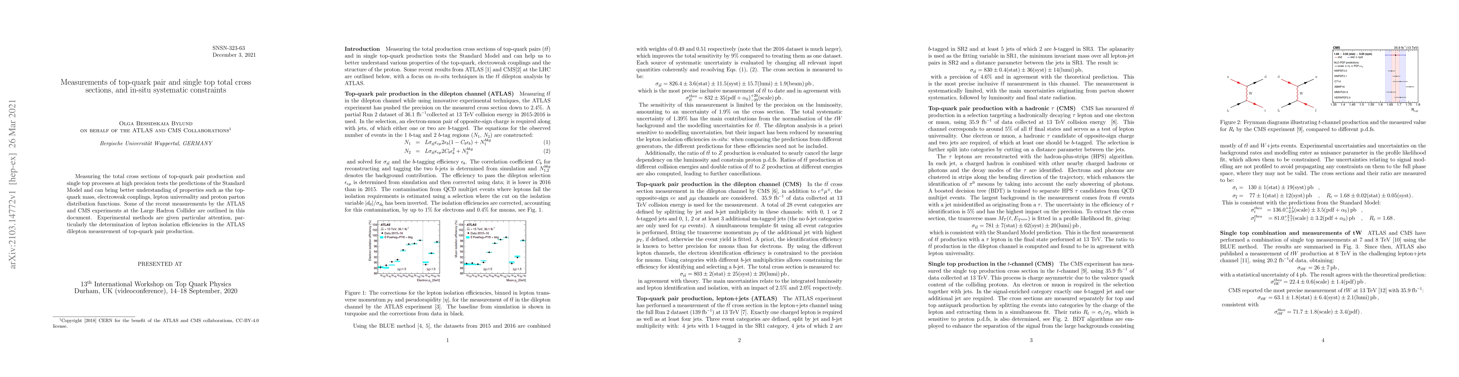 Measuring the total cross sections of top-quark pair production and single top processes at high precision tests the predictions of the Standard Model and can bring better understanding of properties such as the top-quark mass, electroweak couplings, lepton universality and proton parton distribution functions. Some of the recent measurements by the ATLAS and CMS experiments at the Large Hadron Collider are outlined in this document. Experimental methods are given particular attention, particularly the determination of lepton isolation efficiencies in the ATLAS dilepton measurement of top-quark pair production.
