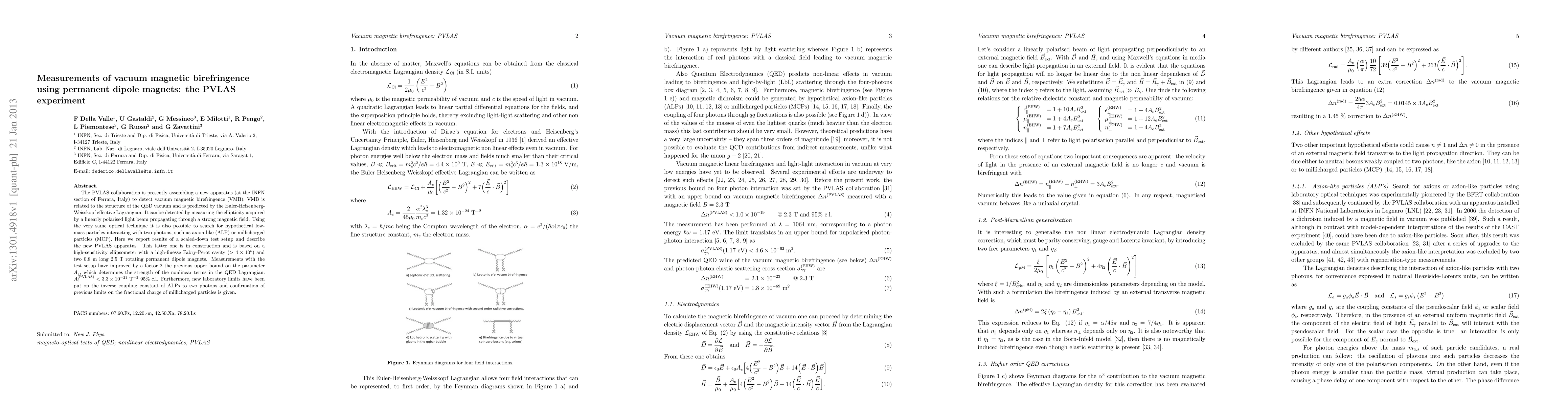 The PVLAS experiment aims to detect vacuum magnetic birefringence using a high-sensitivity ellipsometer and permanent dipole magnets. Initial test results have improved the upper bound on the parameter $A_e$ by a factor of 2, setting $A_e^{\rm (PVLAS)} < 3.3 \times 10^{-21}$ T$^{-2}$ at 95% confidence level, and have also provided new limits on axion-like particles and millicharged particles.