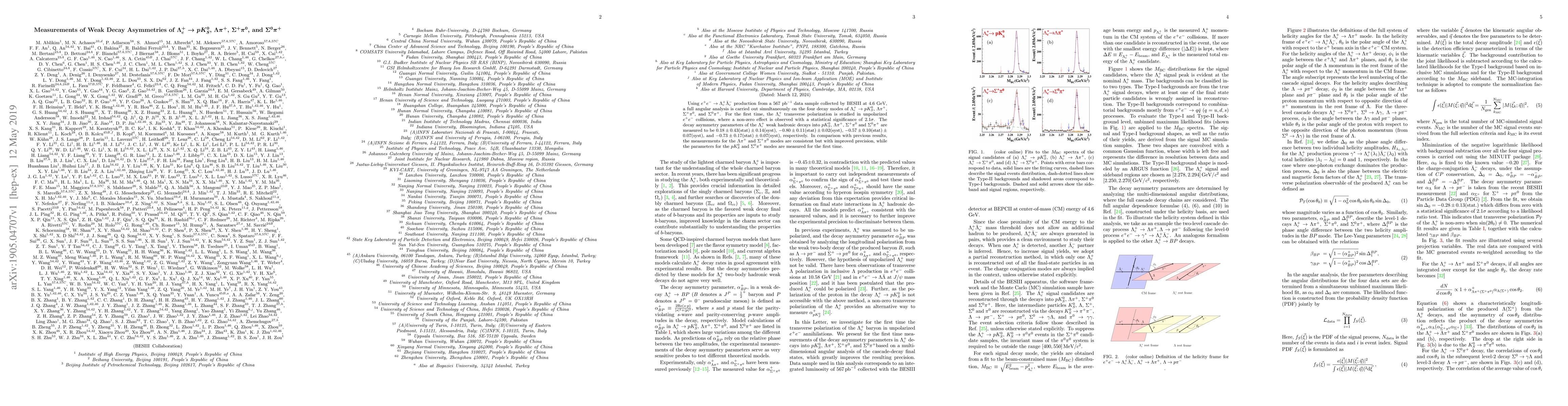 Using $e^+e^-\to\Lambda_c^+\bar\Lambda_c^-$ production from a 567 pb$^{-1}$ data sample collected by BESIII at 4.6 GeV, a full angular analysis is carried out simultaneously on the four decay modes of $\Lambda_c^+\to pK_S^0$, $\Lambda \pi^+$, $\Sigma^+\pi^0$, and $\Sigma^0\pi^+$. For the first time, the $\Lambda_c^+$ transverse polarization is studied in unpolarized $e^+e^-$ collisions, where a non-zero effect is observed with a statistical significance of 2.1$\sigma$. The decay asymmetry parameters of the $\Lambda_c^+$ weak hadronic decays into $pK_S^0$, $\Lambda\pi^+$, $\Sigma^+\pi^0$ and $\Sigma^0\pi^+$ are measured to be $0.18\pm0.43(\rm{stat})\pm0.14(\rm{syst})$, $-0.80\pm0.11(\rm{stat})\pm0.02(\rm{syst})$, $-0.57\pm0.10(\rm{stat})\pm0.07(\rm{syst})$, and $-0.73\pm0.17(\rm{stat})\pm0.07(\rm{syst})$, respectively. In comparison with previous results, the measurements for the $\Lambda\pi^+$ and $\Sigma^+\pi^0$ modes are consistent but with improved precision, while the parameters for the $pK_S^0$ and $\Sigma^0\pi^+$ modes are measured for the first time.