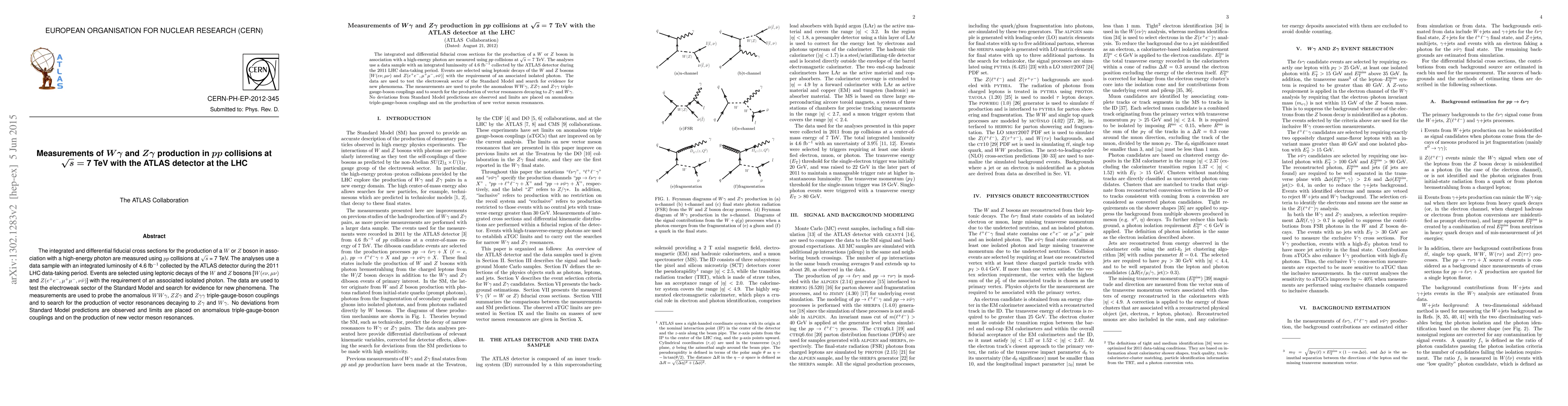 This paper reports measurements of Wγ and Zγ production cross sections in proton-proton collisions at 7 TeV using the ATLAS detector at the LHC, with a focus on testing the Standard Model and searching for new physics. No deviations from Standard Model predictions are observed, and limits are set on anomalous triple-gauge-boson couplings and new vector meson resonances.