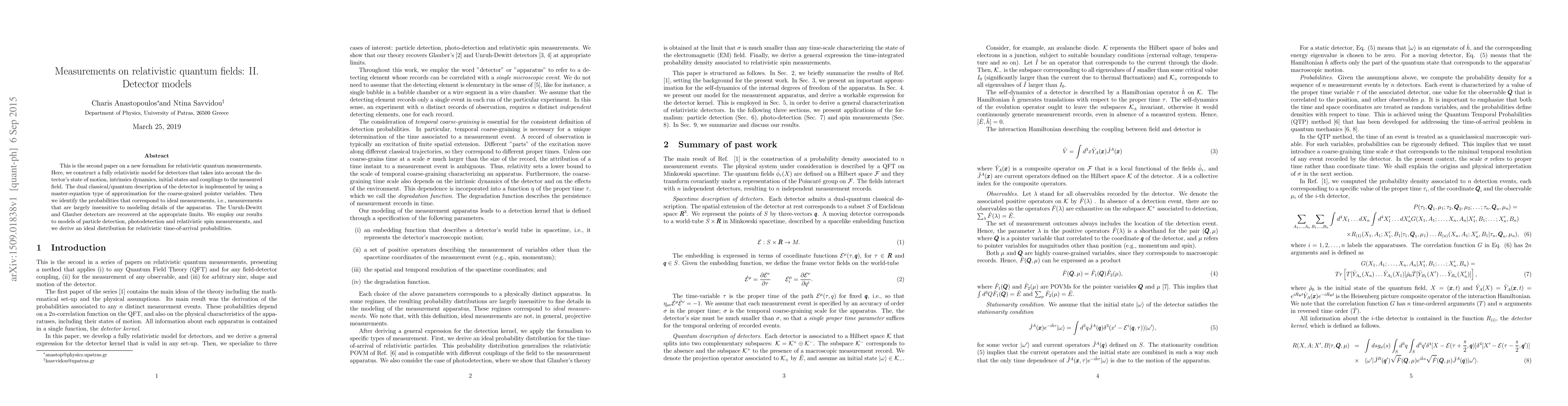 This is the second paper on a new formalism for relativistic quantum measurements. Here, we construct a fully relativistic model for detectors that takes into account the detector's state of motion, intrinsics dynamics, initial states and couplings to the measured field. The dual classical/quantum description of the detector is implemented by using a master-equation type of approximation for the coarse-grained pointer variables. Then we identify the probabilities that correspond to ideal measurements, i.e., measurements that are largely insensitive to modeling details of the apparatus. The Unruh-Dewitt and Glauber detectors are recovered at the appropriate limits. We employ our results to models of particle detection, photodetection and relativistic spin measurements, and we derive an ideal distribution for relativistic time-of-arrival probabilities.