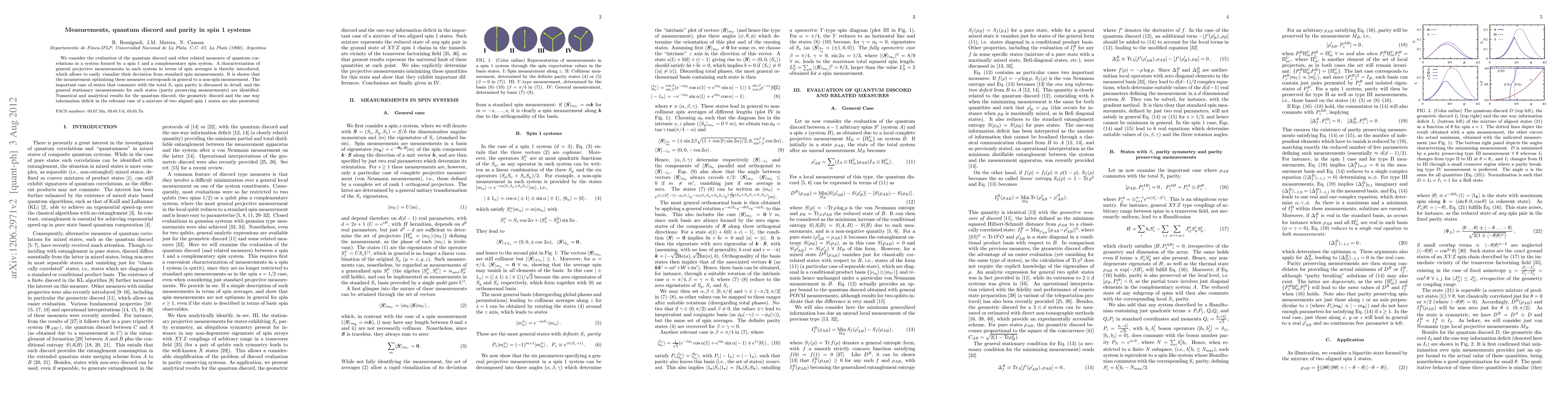 This paper explores quantum discord and related measures in spin 1 systems, introducing a characterization of general projective measurements that often deviate from standard spin measurements.