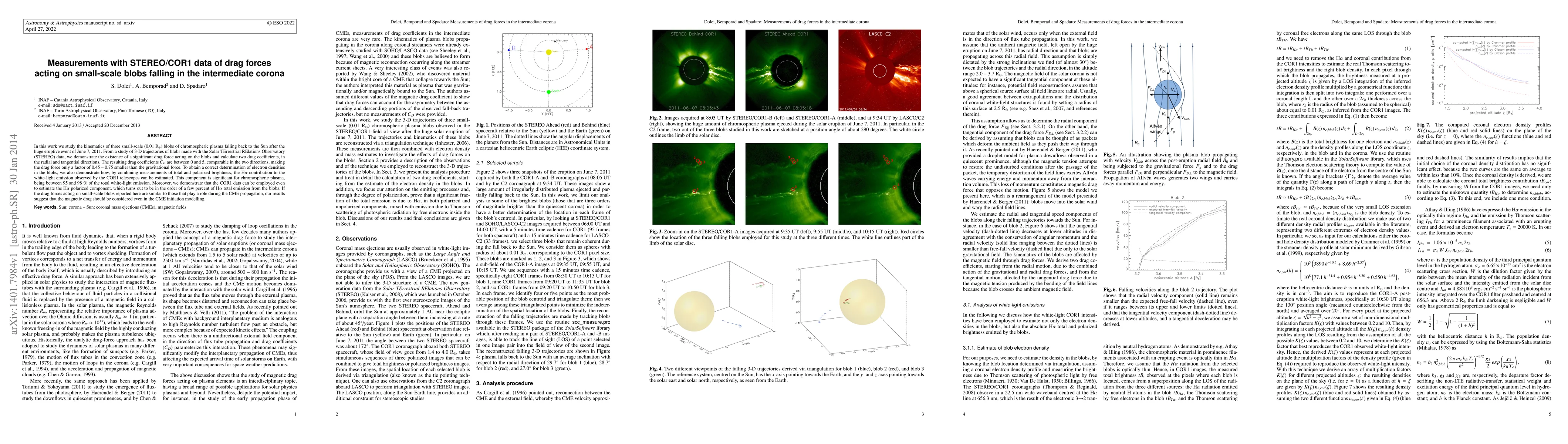 In this work we study the kinematics of three small-scale (0.01 R$_\odot$) blobs of chromospheric plasma falling back to the Sun after the huge eruptive event of June 7, 2011. From a study of 3-D trajectories of blobs made with the Solar TErrestrial RElations Observatory (STEREO) data, we demonstrate the existence of a significant drag force acting on the blobs and calculate two drag coefficients, in the radial and tangential directions. The resulting drag coefficients $C_D$ are between 0 and 5, comparable in the two directions, making the drag force only a factor of 0.45-0.75 smaller than the gravitational force. To obtain a correct determination of electron densities in the blobs, we also demonstrate how, by combining measurements of total and polarized brightness, the H$\alpha$ contribution to the white-light emission observed by the COR1 telescopes can be estimated. This component is significant for chromospheric plasma, being between 95 and 98 % of the total white-light emission. Moreover, we demonstrate that the COR1 data can be employed even to estimate the H$\alpha$ polarized component, which turns out to be in the order of a few percent of H$\alpha$ total emission from the blobs. If the drag forces acting on small-scale blobs reported here are similar to those that play a role during the CME propagation, our results suggest that the magnetic drag should be considered even in the CME initiation modelling.