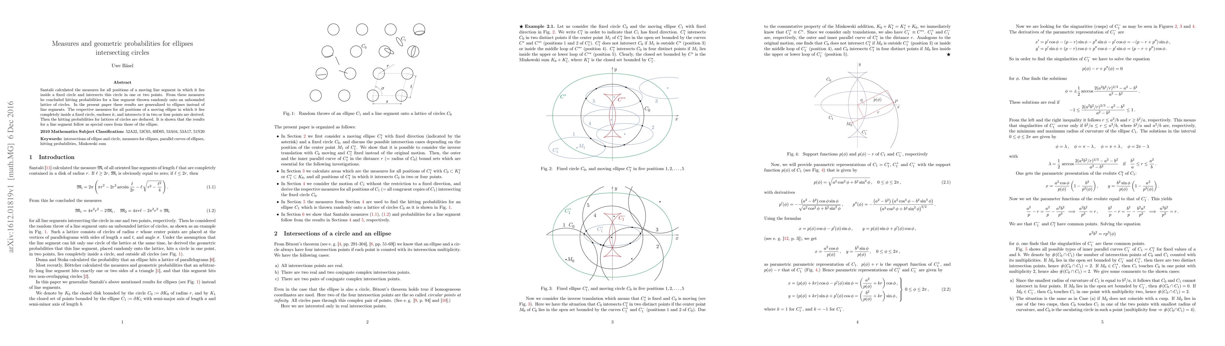 Santal\'o calculated the measures for all positions of a moving line segment in which it lies inside a fixed circle and intersects this circle in one or two points. From these measures he concluded hitting probabilities for a line segment thrown randomly onto an unbounded lattice of circles. In the present paper these results are generalized to ellipses instead of line segments. The respective measures for all positions of a moving ellipse in which it lies completely inside a fixed circle, encloses it, and intersects it in two or four points are derived. Then the hitting probabilities for lattices of circles are deduced. It is shown that the results for a line segment follow as special cases from those of the ellipse.