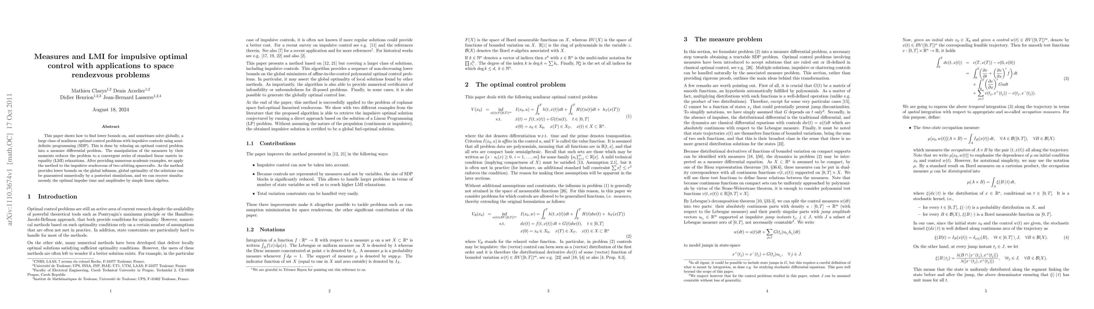 This paper shows how to find lower bounds on, and sometimes solve globally, a large class of nonlinear optimal control problems with impulsive controls using semi-definite programming (SDP). This is done by relaxing an optimal control problem into a measure differential problem. The manipulation of the measures by their moments reduces the problem to a convergent series of standard linear matrix inequality (LMI) relaxations. After providing numerous academic examples, we apply the method to the impulsive rendezvous of two orbiting spacecrafts. As the method provides lower bounds on the global infimum, global optimality of the solutions can be guaranteed numerically by a posteriori simulations, and we can recover simultaneously the optimal impulse time and amplitudes by simple linear algebra.