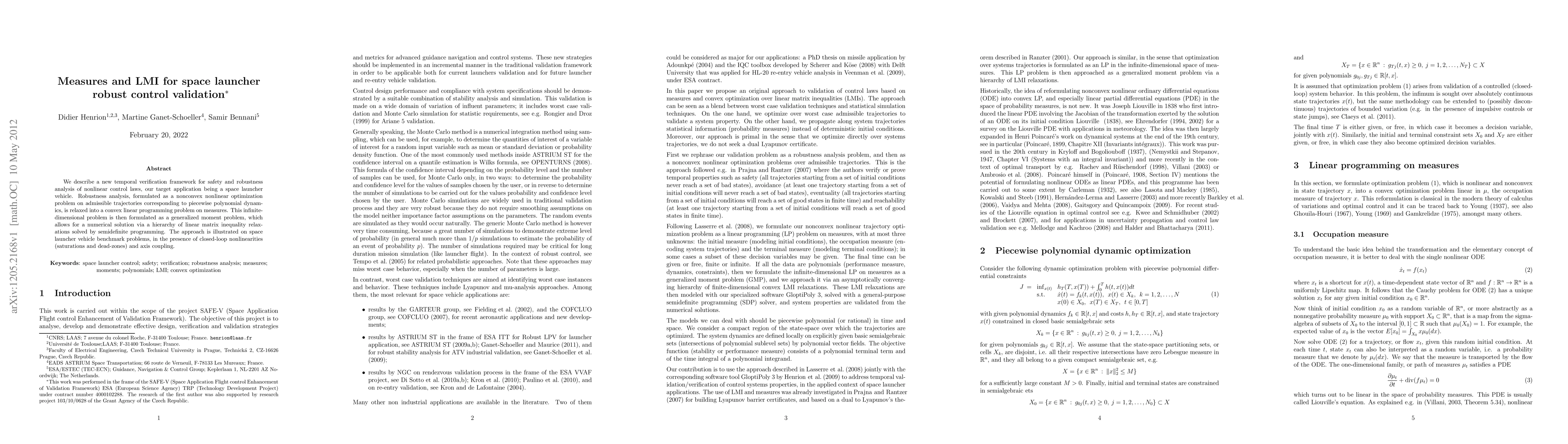 We describe a new temporal verification framework for safety and robustness analysis of nonlinear control laws, our target application being a space launcher vehicle. Robustness analysis, formulated as a nonconvex nonlinear optimization problem on admissible trajectories corresponding to piecewise polynomial dynamics, is relaxed into a convex linear programming problem on measures. This infinite-dimensional problem is then formulated as a generalized moment problem, which allows for a numerical solution via a hierarchy of linear matrix inequality relaxations solved by semidefinite programming. The approach is illustrated on space launcher vehicle benchmark problems, in the presence of closed-loop nonlinearities (saturations and dead-zones) and axis coupling.