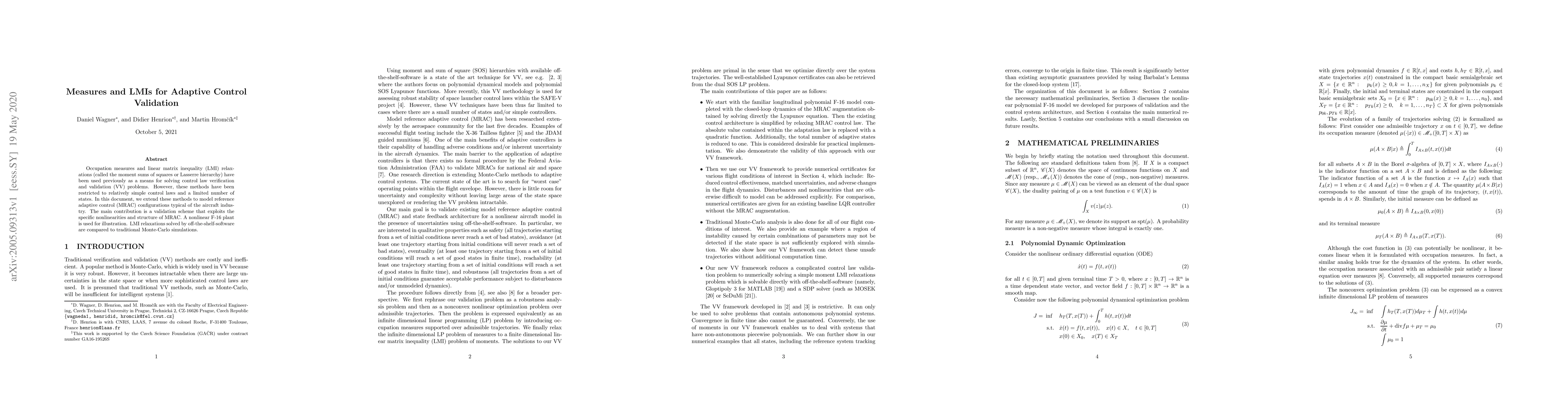 Occupation measures and linear matrix inequality (LMI) relax-ations (called the moment sums of squares or Lasserre hierarchy) have been used previously as a means for solving control law verification and validation (VV) problems. However, these methods have been restricted to relatively simple control laws and a limited number of states. In this document, we extend these methods to model reference adaptive control (MRAC) configurations typical of the aircraft industry. The main contribution is a validation scheme that exploits the specific nonlinearities and structure of MRAC. A nonlinear F-16 plant is used for illustration. LMI relaxations solved by off-the-shelf-software are compared to traditional Monte-Carlo simulations.