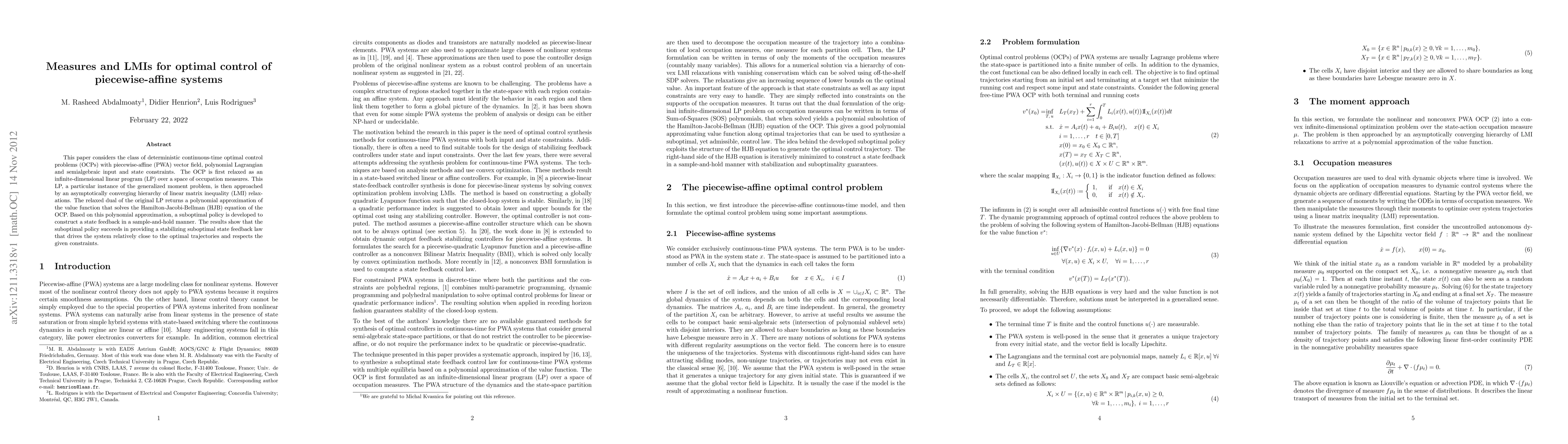 This paper develops LMI relaxations for optimal control of piecewise-affine systems, transforming the infinite-dimensional linear program into a hierarchy of LMIs. The resulting suboptimal policy provides a stabilizing state feedback law that respects constraints and drives the system close to optimal trajectories.