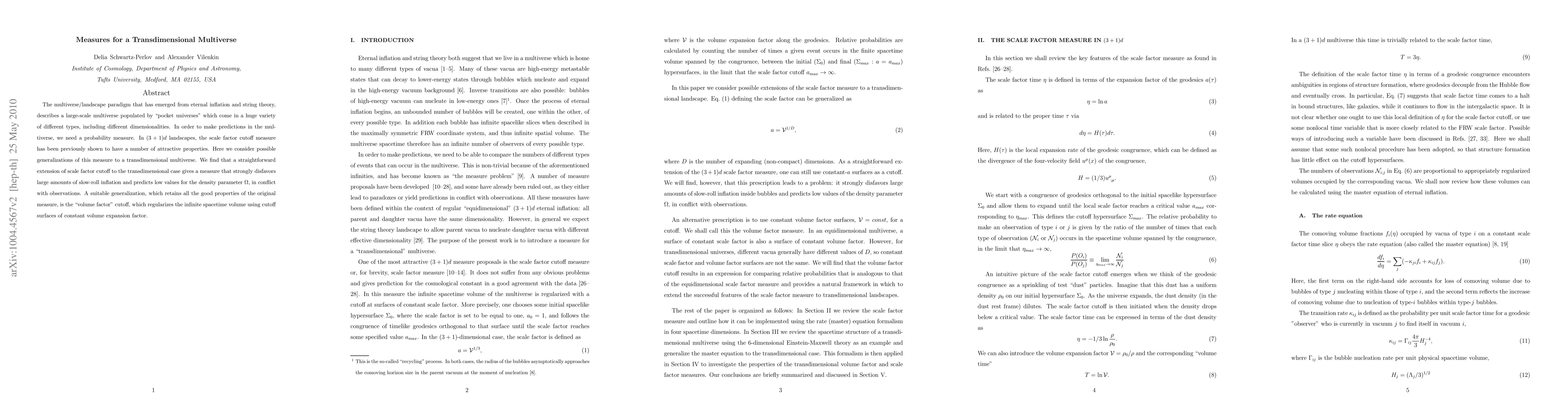This paper explores probability measures for a transdimensional multiverse arising from string theory, proposing that the "volume factor" cutoff, which uses cutoff surfaces of constant volume expansion factor, is a suitable generalization that maintains desirable properties while avoiding conflicts with observational data.