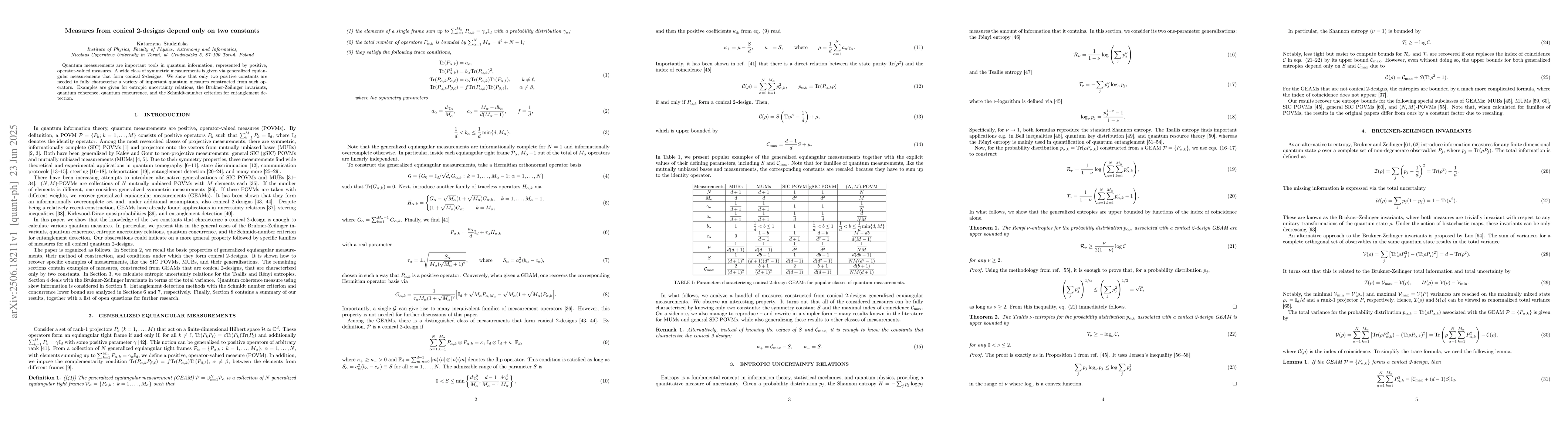 Quantum measurements are important tools in quantum information, represented by positive, operator-valued measures. A wide class of symmetric measurements is given via generalized equiangular measurements that form conical 2-designs. We show that only two positive constants are needed to fully characterize a variety of important quantum measures constructed from such operators. Examples are given for entropic uncertainty relations, the Brukner-Zeilinger invariants, quantum coherence, quantum concurrence, and the Schmidt-number criterion for entanglement detection.